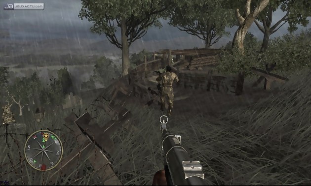 Sur ce point, Call of Duty 3 : En Marche vers Paris ne faillit pas à la réputation de la série ; et le joueur qui aura déboursé 70 € aura de quoi s’émerveiller sur les séquences de bravoure et de combat qui s’enchaînent à tour de bras. Explosions à tire-larigot, ennemis qui hurlent comme des sauvages dans la langue de Goethe, balles qui fusent de part et d’autre et qui ricochent parfois sur le casque, les développeurs ont accéléré la cadence par rapport au dernier épisode, à défaut de grandes nouveautés. C’est d’ailleurs un point sur lequel on peut pas trop accabler Call of Duty 3 : En Marche vers Paris qui mise donc une fois encore sur une mise en scène spectaculaire et cinématographique. L’aspect technique a été revu à la hausse et on ne se loupera pas en disant que Call of Duty 3 : En Marche vers Paris est plus beau que son prédécesseur. Il suffit de voir par exemple la modélisation des personnages, bien plus convaincantes que par le passé, notamment au niveau des uniformes qui comportent bon nombre de plis. On est loin d’un Gears of War mais dans l’ensemble, le titre reste très plaisant à regarder et peut dignement faire partie de la famille des jeux next gen’. Les décors ont également été le fruit d’un travail de qualité avec des environnements qui fourmillent de détails et d’animations. Contempler ces champs d’herbe et ces branches d’arbres se plisser au gré du vent est un spectacle saisissant. En parlant de vent, les développeurs avaient énormément mis l’accent sur le fait que cet élément naturel avait un rôle déterminant dans le jeu, dans la mesure où il servait à dissiper plus rapidement un écran de fumé créé par une grenade fumigène. Il faut croire que Treyarch nous a bien baratiné car à aucun moment, cet élément apparaît dans le jeu…