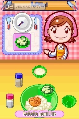 Une simulation de cuisine ? Le concept ou plutôt la recette ne date pas d’hier, du moins au Japon où le genre s’est taillé une belle réputation auprès de la nouvelle génération de joueurs mais surtout de joueuses, cible première de ces jeux au concept bien décalé. Dans Cooking Mama, le joueur endosse donc le tablier d’un jeune apprenti cuisinier qui va apprendre en quelques coups de cuillère à pot à préparer des recettes classiques de la gastronomie japonaise. Soupe Miso, gyozas grillés, curry de porc, Takoyaki, riz aux pousses de bambou, Tonjiru, des plats exotiques auxquels se mêlent des recettes venues de l’Occident tels que le poulet rôti, le steak frites, la pizza, la côtelette de porc ou bien encore les spaghettis à la Napolitaine. Ce n’est pas moins de 120 recettes qui nous attendent au total dans Cooking Mama, des préparations culinaires que l’on découvre au fur et à mesure que l’on réussit les diverses préparations dans le mode "Cuisine". Il va donc falloir se montrer à la hauteur pour pouvoir débloquer l’ensemble des 120 recettes et gagner ses galons de Maïté ou de Cyril Lignac en herbe, c’est vous qui choisissez.