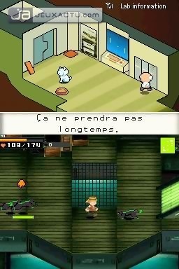 Contact est au RPG ce que Killer7 est au jeu d’action. Particulièrement dans le sens où il est en complet décalage avec ses contemporains. A ce titre, on peut vous annoncer d’emblée qu’il ne conviendra pas à tout le monde. En effet, Contact impose un rythme particulier par un triolisme étonnant : le professeur, siégeant dans l’écran supérieur et qui vous donnera mille et un conseils pour l’accomplissement de votre mission ; le héro, véritable acteur de l’aventure et le joueur proprement dit. Ainsi, le professeur tentera d’instaurer un dialogue privilégié avec le joueur par l’intermédiaire de la DS. Malheureusement, la glace se brise trop difficilement pour faire des étincelles mais on salue tout de même cette initiative. Traqué par une mystérieuse organisation extraterrestre nommée Mutestant, le professeur se crashe sur notre planète où il fait la rencontre d’un jeune garçon muet, Terry. Très rapidement, il le charge de récupérer les 6 éléments disséminés un peu partout dans le monde. Convoités par Mutestant pour permettre l’élaboration d’une arme de destruction massive, ces éléments permettront au professeur de réparer son vaisseau spatial. Transformé en galion pour l’occasion, ce dernier vous offrira la possibilité de voyager d’île en île (huit en tout) pour parfaire votre mission. Une aventure malheureusement limitée par le temps puisqu’on peut compter un peu plus d’une dizaine d’heures à peine pour boucler le jeu. Le système de progression est très classique et se limite à : « village-donjon-boss, on recommence et c’est gagné ». De nombreuses quêtes annexes sont pourtant de la partie mais elles apportent trop peu pour que l’on daigne y prêter attention. Derrière tout cela, le jeu se pose avec une remarquable simplicité et un naturel déconcertant. Si Terry doit en quelque sorte sauver le monde, on est très loin de ce côté grave et profond, voire pesant des autres jeux de rôles. C’est bien simple, Contact ne se prend pas du tout au sérieux. Bourré d’humour et de situations insolites en tous genres (il faut par exemple prendre un bain chaud pour remonter ses points de vie), le jeu fait également la part belle à de nombreuses références vidéoludiques. Le professeur peste contre les mises à jour de son ordinateur forçant son redémarrage, que l’on devine provenir de Windows Update. Clins d’œil également à Pikmin, Donjons & Dragons, Pong, Ghosts and Goblins, Oblivion, etc. Mieux vaut donc posséder une certaine culture et faire partie de la catégorie des geeks pour en profiter au maximum. Tout cela lui confère un cachet et un charme certain et finit malgré tout à scotcher les doigts du joueur à sa console.