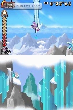Inutile de tourner autour du pot pendant des heures, tout le monde connaît Sonic. Suite directe du premier opus paru il y a maintenant deux ans sur la portable au double-écran, Sonic Rush Adventure ne va pas chercher bien loin les bases de son gameplay. A vitesse grand V, il s’agira encore une fois de traverser les niveaux qui parsèment le jeu, et comme l’a instauré le premier Sonic Rush, ils occuperont les deux écrans en mêlant 2D classique et éléments en 3D. Signalons tout de même pour ceux qui l’ignorent encore que ces derniers font plus figure d’effets de style et que leurs apports ludiques relèvent de l’anecdotique. En parlant de style, Sonic bénéficie en toute logique de sa panoplie de mouvements : spin-dash, course sautée, double saut, jauge de turbo… Le tutorial en début de jeu se chargera de vous expliquer de manière concise et efficace de quoi il en retourne. De même, les boss s’inscrivent dans la tradition initiée il y a deux ans. Entièrement en 3D, ils jouissent d’une réalisation correcte, mais se démarquent surtout par l’originalité dont ont fait preuve les développeurs pour qu’on en vienne à bout. La réalisation est donc exemplaire, et seul le boss du bateau-pirate fait ramer étrangement la console.