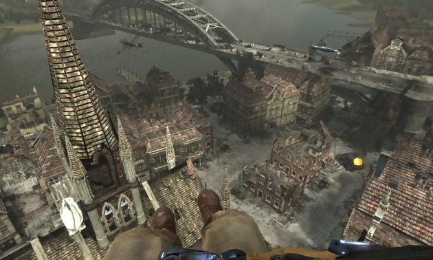 Qu’il s’agisse de Call of Duty, de Brothers in Arms et bien sûr de Medal of Honor, on rabâche inlassablement les mêmes aventures et mésaventures de plusieurs troupes aéroportées, venues défaire l’ennemi nazi sur le territoire européen. Mais on oublie souvent de nous raconter comment ces héros de la Seconde Guerre Mondiale sont parvenus à libérer Paris, à sauver la population italienne des chemises noires, et à contrôler Berlin du ciel jusqu’au plancher des vaches. Voilà donc le but premier de ce Medal of Honor : Airborne, nous faire vivre les quelques minutes qui précèdent les sauts des parachutistes américains avant qu’ils ne mettent le pied au sol. Bien entendu, les missions ne se cantonneront pas qu’à la voltige car elles ne représentent que quelques secondes de jeu. C’est bien l’arme au poing qu’il faudra faire ses preuves dans les célèbres opérations Avalanche, Neptune, Market Garden, Varsity avant de faire exploser la Tour Der Flakturm dans un ultime feu d’artifices. Ne vous frottez pas les yeux, il y a bien cinq missions dans Medal of Honor : Airborne, uniquement cinq. Premier bémol important donc pour le jeu d’Electronic Arts, d’autant plus important qu’il ne faut pas compter sur plus d’une heure par niveau pour en voir le bout. Cinq à six heures de jeu seront nécessaires pour boucler l’aventure ; et même en augmentant le niveau de difficulté, vous obtiendrez quelques minutes de sursis supplémentaires vu que les niveaux sont découpés en plusieurs objectifs, chacun proposant un point de sauvegarde. Ces checkpoints offrent une certaine facilité de jeu mais s’avèrent parfois réellement agaçants, vous obligeant à sauter de nouveau en parachute et traverser le niveau en entier, afin de retrouver vos marques en cas de game over.