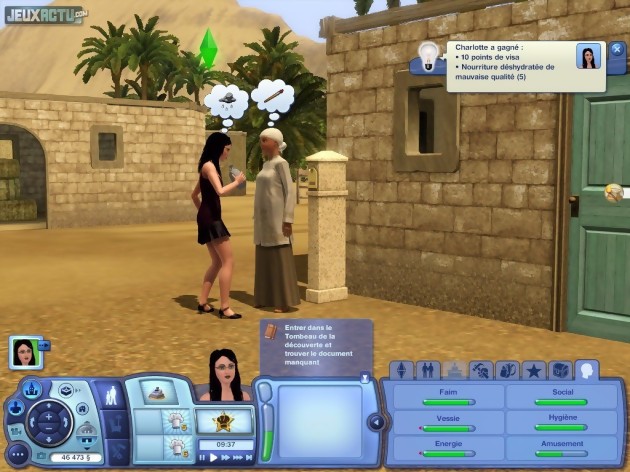 Une fois l'extension installée, vos Sims n'ont plus qu'à utiliser leur téléphone portable, leur téléphone fixe ou leur ordinateur pour avoir accès au planificateur de voyages. Cette nouvelle interface permet de choisir sa destination parmi les trois proposées : Shang Simla en Chine, Al Simhara en Egypte et Champs-les-Sims en France. On y détermine également la durée du séjour, qui se voit toutefois limitée par le type de visa que l'on possède actuellement. Sachant qu'un meilleur visa ne peut s'obtenir qu'en voyageant dans le pays concerné, on comprend vite qu'il faudra retourner plus d'une fois dans chaque destination. Enfin, il n'y a plus qu'à choisir d'éventuels compagnons de voyage. Le coût total de l'opération s'affiche alors et, si l'on possède suffisamment d'argent, un taxi vient immédiatement nous chercher. Un bon gros temps de chargement plus tard, voici les Sims téléportés dans le pays désiré. Dans un premier temps, le dépaysement est essentiellement esthétique puisque les pagodes de Chine, les pyramides d'Egypte et les maisons typiquement françaises n'ont pas grand chose à voir avec la banlieue américaine. Mais très vite, on se rend compte que le gameplay a également subi une franche refonte. Certes, même en voyage, il faut toujours gérer le quotidien des Sims et veiller à leur alimentation, leur sommeil, leur état d'esprit et leur hygiène. Pour cela, ils disposent initialement d'un camp de base qui contient le minimum vital (lit, toilettes...) et peuvent, à terme, acheter une résidence secondaire dans les parages. Et si les discussions avec les autochtones et les emplettes dans les marchés locaux ne sont en rien révolutionnaires, la présence d'un Tableau des aventures vient en revanche quelque peu bouleverser la routine du joueur. Il sert en effet de point de départ à toute une série de quêtes basées notamment sur l'exploration de lieux anciens.