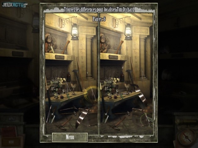 L'essentiel du gameplay repose en réalité sur le concept d'objets cachés. Chaque scène est constellée de plusieurs dizaines d'objets et il suffit de cliquer sur ceux que le marshall Daniels recherche pour débloquer l'action et faire avancer le scénario. Les variations de taille, les superpositions ou encore le positionnement sur des fonds de couleur proche amplifient la dissimulation mais ne suffisent jamais à rendre la tâche insurmontable. Ce principe basique, voire enfantin, n'est pas foncièrement désagréable mais finit rapidement par lasser. Les développeurs ont bien tenté d'injecter un peu de variété en nous demandant par moments de retrouver des nombres dissimulés dans le décor (sous le prétexte que les schizophrènes de l'établissement psychiatrique "traduisent les nombres et les symboles en codes pour les aider à maintenir leurs délires"), en représentant les scènes de cauchemar du héros par un passage de l'image en négatif qui complique légèrement la recherche, ou encore en alternant une présentation visuelle avec une description nominative des objets à retrouver. On nous demande même à un moment de deviner la nature des objets à partir d'une définition élusive et poétique, à la manière d'une énigme orientale. Mais cette idée n'est hélas pas assez exploitée. De même, le jeu se dote de quelques casse-têtes que ne renierait pas le professeur Layon (cinq exactement) mais ils sont toujours très simples (engrenages, fils emmêlés, calcul, serrure, jeu des différences) et, surtout, s'avèrent en réalité totalement facultatifs. Si vous passez un peu trop de temps à tenter de les résoudre, une option "passer le mini-jeu" apparaît et son utilisation n'entraîne strictement aucune pénalité. Plus casual, tu meurs ! Dans le même ordre d'idées, une lampe-torche qui se recharge en quelques dizaines de secondes vous permettra de mettre en lumière la position d'un objet trop bien caché que vous n'auriez pas réussi à dénicher. Et le pseudo-inventaire que nous évoquions dans le chapitre précédent ne sert qu'au stockage automatique d'objets à déposer quelques secondes plus tard sur une zone interactive bien déterminée et indiquée de manière très voyante (linéarité maximum garantie). Conséquence de cette absence totale de challenge : un joueur aguerri mettra moins de deux heures à boucler l'aventure !