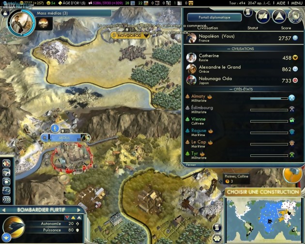 Comble de la félicité : la richesse du jeu ne signifie en rien qu'il se révèle trop complexe pour pouvoir être apprécié par des débutants. Il faut dire que l'interface a été revue et nettement corrigée. Désormais éclatée en différents modules, elle dissimule habilement les informations les plus détaillées afin de n'effrayer personne, tout en permettant de réaliser avec efficacité et simplicité l'ensemble des actions essentielles. Le bouton "Tour suivant" devient même contextuel et n'apparaît que lorsqu'il n'y a plus rien d'important à accomplir. Dans le cas contraire il affiche plutôt la mention "unité en attente d'ordres", "choisir une construction", "choisir une technologie", "message d'une cité-état" ou encore "adopter une doctrine" et renvoie naturellement vers l'action ou le panneau correspondant. Une bien bonne idée qui évite de laisser passer une action primordiale à cause d'un bête empressement. On pourrait également louer les progrès graphiques qui, sans être extraordinaires, sont tout de même appréciables. La 3D affichée est classique, mais de bonne facture. Et, surtout, le jeu tournera parfaitement sur un PC vieillissant. Même lors des tours les plus avancés, lorsque l'IA a des milliers de paramètres à calculer, on souffre rarement d'animations trop saccadées ou de temps d'attente interminables. En revanche, la réalisation purement technique est loin d'être parfaite. Nous avons eu à déplorer de fréquents plantages avec retour brutal sous Windows (heureusement qu'il y a une sauvegarde automatique tous les dix tours d'ailleurs...), un bug qui remettait subitement les voix en anglais sans que nous touchions aux options de langue, et des didacticiels qui ne fonctionnent carrément pas du tout (aucun conseiller pour nous dire quoi faire dans ces quelques missions spécifiques, alors que tout marchait bien sur la version preview testée il y a quelques semaines). On peut également regretter l'impossibilité de zapper la séquence d'introduction, qu'il faut donc subir à chaque lancement du jeu. Ou encore les problèmes de traduction qui aboutissent à l'affichage de messages tels que "le Oslo a été conquis". Les joueurs attachés à la notion de scénario ou d'objectifs précis se désoleront quant à eux de l'absence de campagne solo ou de quelques missions plus dirigistes. Et, sur le fond, on peut naturellement pointer du doigt la disparition totale du concept de religion. La perspective de voir tout fanatisme disparaître de la surface de la planète peut paraître intéressante dans l'absolu, mais elle n'a absolument rien de réaliste à l'heure où certains fondamentalismes religieux prennent de plus en plus de place...