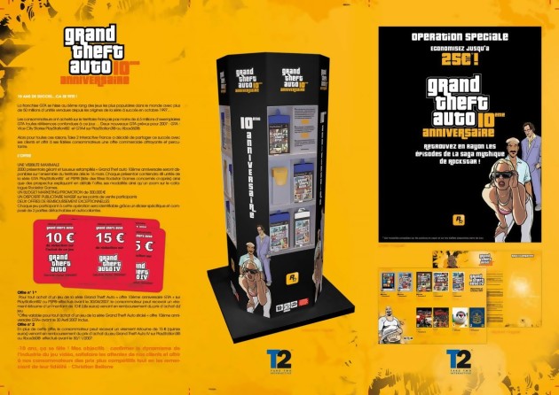 Dix ans de Grand Theft Auto et plus de 4,5 millions de jeux vendus rien que sur le territoire français ça se fête ! Et Take Two Interactive n’y va pas avec le dos de la cuillère en proposant une opération valable jusqu’au 30 avril 2007. Pour tout achat d’un jeu GTA estampillé de l’étiquette « Offre 10ème Anniversaire », l’acheteur aura droit à une réduction de 10 € sur le jeu de son choix sur PlayStation 2 ou PSP. Mais ce n’est pas tout ! Afin d’assurer les ventes de Grand Theft Auto IV, ces mêmes clients recevront un bon de réduction de 15 € à valoir sur l’achat du prochain épisode sur Xbox 360 et PlayStation 3 dont la sortie est prévue le 19 octobre 2007.