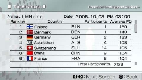 Ne doutons plus. Cessons de nous poser la question. D3 Publisher va nous permettre tester et connaître les résultats de notre quotient intellectuel grâce à son jeu PQ : Practical Intelligence Quotient. Disponible au Japon depuis le mois dernier, ce jeu de réflexion est également prévu en Europe pour le 10 mars prochain. Placé sous la houlette d'un professeur d'université, le joueur va devoir résoudre une série d'énigmes et de puzzles afin de savoir si sa matière grise se porte bien, puisque tout est question de logique. Voici les images et la jaquette européenne de ce jeu prévu sur PSP.