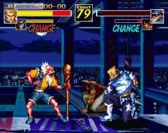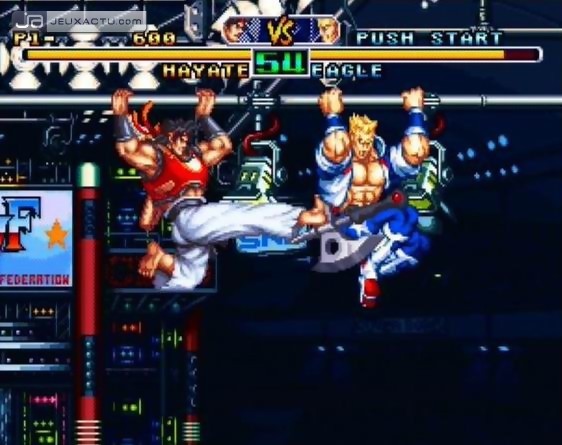 Huitième volume de la gamme NeoGeo Online Collection, Fu-un Super Combo est arrivé ce matin à la rédaction. Une bonne occasion pour nous de vous proposer une galerie de screenshots faits maison, mais également 4 vidéos exclusives. Pour ceux qui n'auraient pas connu l'ère Neo Geo, sachez qu'il s'agit-là des deux épisodes de la saga Fu-un. Aux Etats-Unis et en Europe, le premier épisode est sorti sous le nom de Savage Reign, tandis que le second était paru sous l'appellation Kizuna Encounter : Super Tag Battle. D'une grande rareté, la cartouche Neo Geo AES de Kizuna Encounter : Super Tag Battle se vend aujourd'hui à plus de 10 000 € dans sa version européenne. Un prix exorbitant, à la limite de l'indécence et cette conversion PS2 permettra aux joueurs lambdas de découvrir ou de rédécouvrir ce jeu de baston de 1996. On en profite pour vous glisser ces fonds d'écran fort sympathiques de Fu-un Super Combo. Le test import arrivera par la suite, bien entendu.
