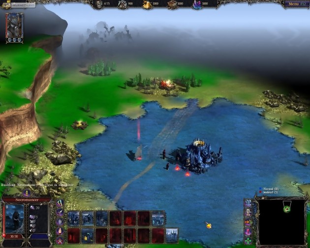 Bref, pour nous, l’équilibre entre les joueurs STR et les autres avec une seule unité se fera sans doute à l’avantage des seconds. Mais après tout, chacun peut opter pour un héros unique et s’affronter des heures avant de déterminer un vainqueur. Le plus grave problème concerne le mode solo orienté STR. L’ordinateur est vraiment doué et ne commet aucune erreur. Faire une percée dans son camp relève de l’exploit. Si juste avant la sortie du jeu, les développeurs pouvaient un peu calmer l’animosité que possède l’I.A. envers l’ensemble des joueurs, nous leur en serions très reconnaissants. Car nous avons pu nous exercer sur un jeu au contenu vraiment très riche : des objets magiques comme s’il en pleuvait, des sorts de fous furieux qui illuminent tout l’écran, quatre races aux gameplays très différents, des graphismes d’une précision absolue et un rythme à couper le souffle. C’est juste trop dur, pour le moment.