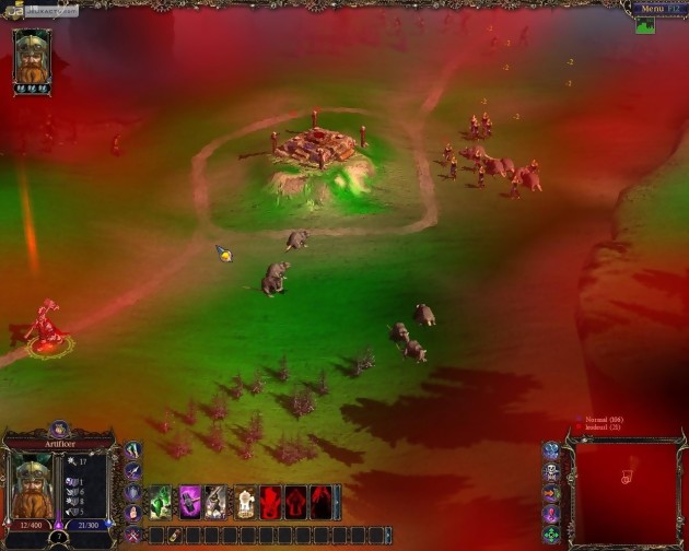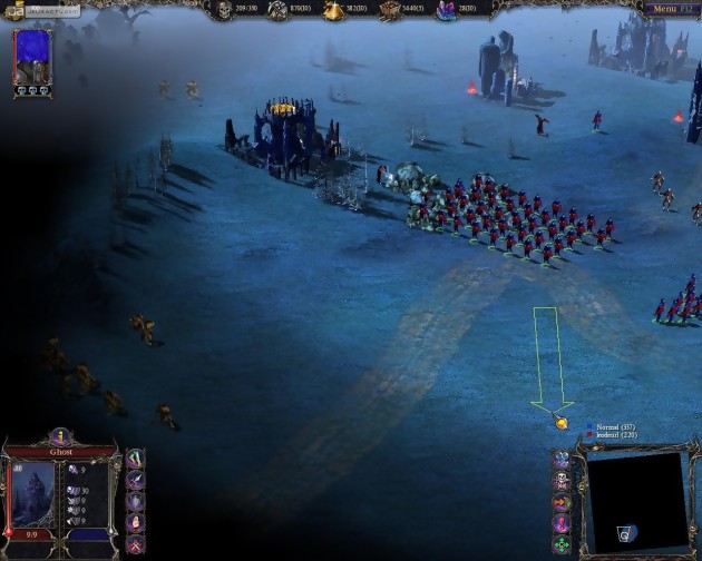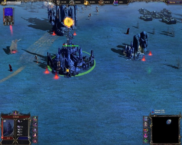 Pour le deuxième, c’était autre chose. Surtout qu’il se faisait aider par l’attaché de presse de GSC Game World. Il s’est engouffré directement dans le jeu de rôles. Pendant la construction de ma base, il avait eu le temps de gagner pas mal d’expérience et c’est un héros gonflé aux testostérones qui est apparu devant mon camp. Le flot continu d’unités et les tourelles ne pouvaient rien y faire, il fallait quelque chose de plus musclé. Pire ! Toutes les victimes sortant des structures lui faisaient gagner de l’expérience. Si les premières minutes laissaient entrevoir un statu quo, la suite allait donner l’avantage au Materazzi qui se trouvait à côté de moi. OK, j’ai perdu mais de ces quelques parties, quelques déductions s’imposent : si un début de partie est assez difficile avec un héros esseulé (il faut choisir les monstres se trouvant sur la carte avec prudence et parcimonie), il n’en va pas du tout de même à la fin où la précieuse unité devient un Gandalf en puissance, terrassant plusieurs dizaines d’unités en invoquant un seul sort. Et que se passe-t-il quand deux héros déchaînés se retrouvent face à face, en se remontant le moral et surtout la mana pendant des heures ? Le premier qui perd doit être le joueur qui meure d’épuisement, trois jours après le début des hostilités. Bref, en multi, dans l’état actuel des choses, je ne vois pas comment il pourrait être plus intéressant d’opter pour