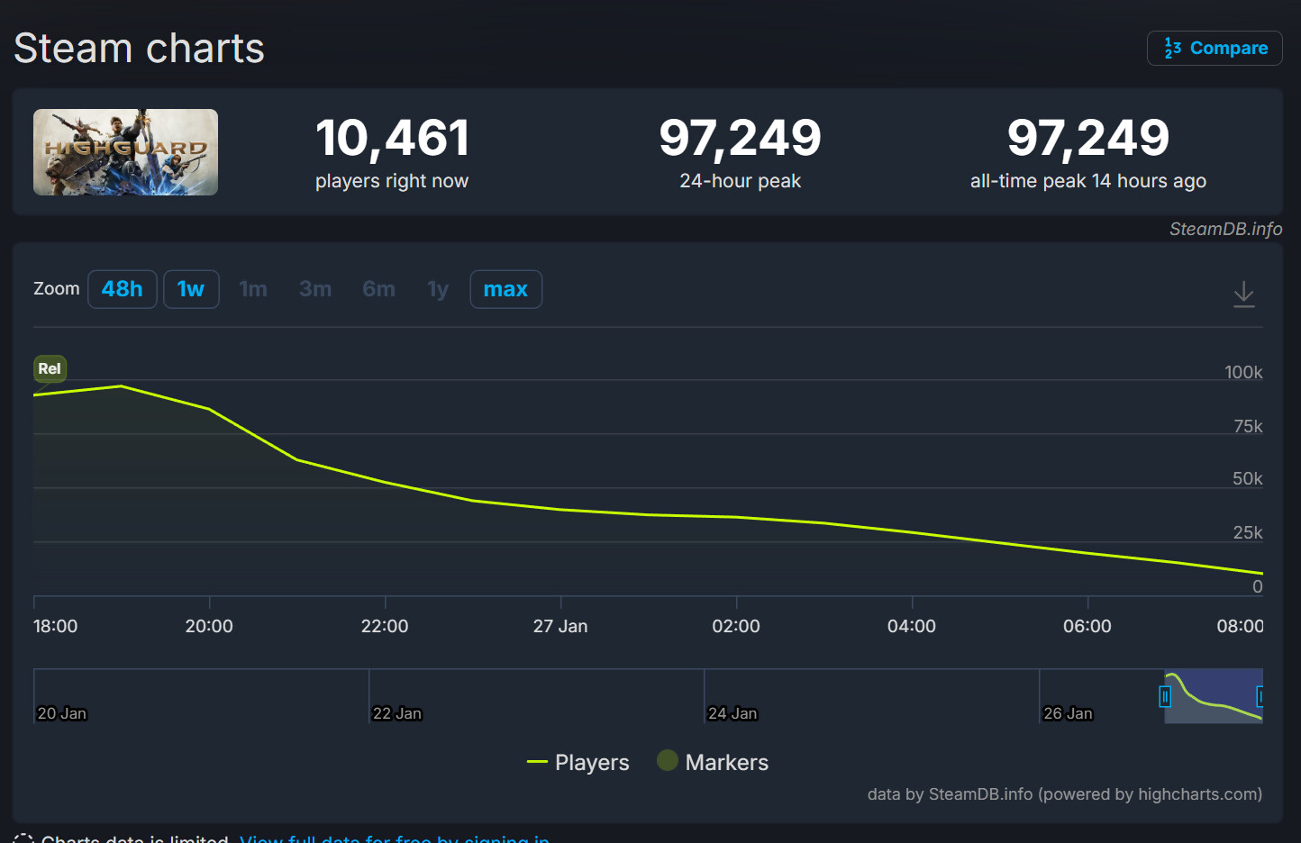 Mais cette stratégie de tout balancer le jour de la sortie a permis au jeu d'avoir une belle exposition tout de même. Au moment de sa sortie, Highguard a enregistré un pic de près de 97 249 joueurs simultanés sur Steam, selon les données de SteamDB. On imagine que ce chiffre a été probablement alimenté par la curiosité des joueurs, d'autant que la réputation des développeurs et une certaine polarisation en ligne autour du projet. Pour mettre ce score en perspective, on n’est certes pas sur les sommets des mastodontes free-to-play du moment, Fortnite ou Counter-Strike 2 eux-mêmes affichent régulièrement des centaines de milliers à plusieurs millions de joueurs en simultané sur Steam, mais pour un nouveau titre sorti de nulle part et sans aucune campagne marketing, flirter avec les 100 000 concurrents est loin d’être anodin.