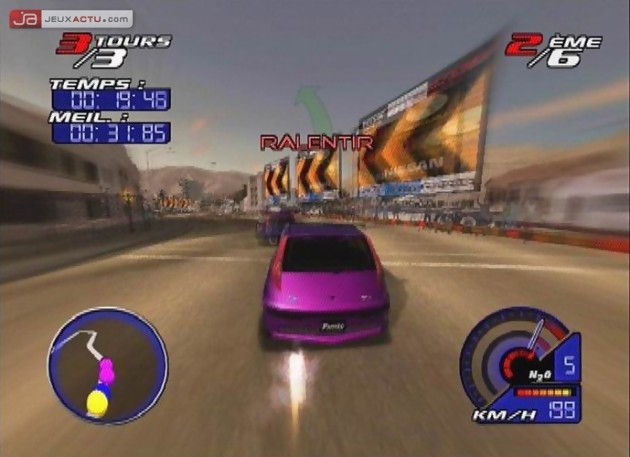 Soyons honnêtes, lorsque l’on évoque le nom de Juiced, n’importe quel joueur normalement aware de l’actualité vidéoludique pense irrémédiablement à un jeu de courses orienté arcade et qui pompe allégrement ses inspirations du côté de Burnout, Need For Speed : Underground et autres Midnight Club. C’est en tout cas la politique prise par Acclaim et Juice Games à l’époque et confirmée par l’un des producteurs que l’on a pu rencontrer à Warrington. Ce dernier nous a d’ailleurs confié qu’il classait Juiced dans la catégorie des Need For Speed : Underground et Midnight Club avec en plus un moteur physique réaliste. Jusque-là tout va bien. Il faudra en fait attraper une manette et quelques tours de piste pour se rendre compte qu’en matière de gameplay, Juiced n’a pratiquement rien à voir avec les deux jeux sus-cités. Et ce sentiment d’avoir affaire à un tout autre jeu pouvait se lire sur le visage de la plupart des journalistes présents. Amusez-vous à adopter une conduite arcade façon NFSU ou Midnight Club et vous finirez la tête dans le volant au premier virage venu. Dans Juiced, il va falloir se la jouer plus finaud. Les changements de direction nécessitent systématiquement d’avoir le pied sur le frein car au moindre contact avec un mur quelconque et votre compteur de vitesse se retrouvera au plus bas. Bien entendu, le frein à main peut permettre d’appréhender un virage plus aisément mais là encore, votre bolide n’aura pas la même attitude que ceux de NFSU par exemple. Certains journalistes se sont même amusés à comparer la conduite de Juiced à celle de Project Gotham Racing. Nous n’irons pas jusque-là mais il paraît clairement maladroit de classer Juiced dans la catégorie des jeux purement arcade. Le jeu est donc un mixe entre simulation et arcade avec tout de même un penchant du côté de la simu. Un peu embêtant pour un jeu ayant pour fond de commerce l’aspect arcade du produit.