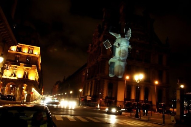 En parallèle de la sortie de la Wii hier soir sur les Champs-Elysées, Ubisoft lançait de son côté le phénomène lapinvasion, en rapport avec la sortie de leur jeu Rayman contre les Lapins Crétins, et dont le site officiel est ouvert depuis peu. Depuis hier soir donc, un camion aux couleurs du jeu se balade furtivement dans les grands boulevards de la capitale française, afin de poser des autocollants de lapins crétins à des lieux stratégiques de Paris. De même, les plus grand monuments de la capitale sont décorés par des spots projetant l'image de ces animaux complètement barjots. Bien vu !