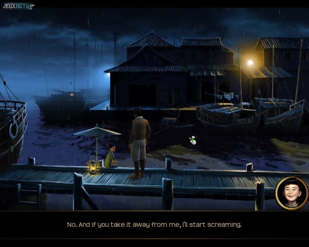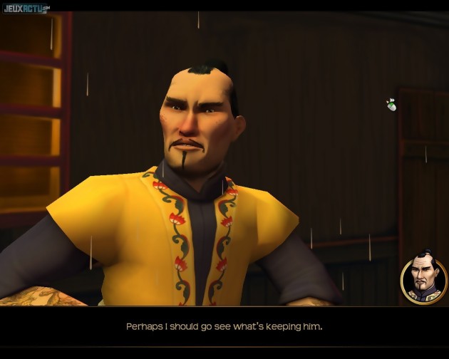 Dans la première heure de jeu, cet assistant d'un nouveau genre nous rappelle par exemple que l'on doit se rendre au Tibet, qu'il faut pour cela retrouver la trace d'un spécialiste de la région, ce qui n'est possible qu'en remettant la main sur une photo de lui, photo qui se trouve dans un coffre-fort dont le code est dans le portefeuille de Fenton, portefeuille qui est actuellement détenu par un jeune garçon, qui acceptera de restituer l'objet à son propriétaire uniquement si on l'aide à capturer une chauve-souris... Vous l'aurez deviné, le jeu ne manque pas d'humour et les énigmes sont souvent farfelues. Elles n'en sont pas insolubles pour autant, quelques allers et retours dans les différents décors et un minimum de réflexion suffisent pour débloquer la plupart des situations. Les déplacements incessants ne sont pas là pour rallonger artificiellement la durée de vie puisqu'un double clic sur une sortie abrège la transition. Et le héros a l'intelligence de se mettre automatiquement à courir lorsqu'on le dirige vers un endroit éloigné. De toutes les manières, c'est toujours un plaisir de parcourir ces décors élégamment dessinés. Les couleurs judicieusement choisies et le trait propre retranscrivent parfaitement l'ambiance des différents lieux. L'aspect sonore n'est pas en reste puisque les dialogues sont intégralement doublés, y compris les phrases du héros que l'on sélectionne lors des discussions en QCM. Uniquement disponibles en VO pour le moment, les voix se montrent justes et les acteurs maîtrisent parfaitement l'accent british. Il n'y a plus qu'à espérer que la localisation en français conserve ces atouts ! On est également en droit d'espérer une certaine coopération entre les deux héros, puisqu'une séquence de ce type était présente dans la version preview que nous avons pu essayer. Dans une telle configuration, un clic sur une icône permet de passer d'un protagoniste à l'autre, et il leur est possible d'échanger des éléments d'inventaire. De quoi enrichir et compliquer un peu la résolution des énigmes. Sur ce, nous vous laissons profiter de nos captures d'écran toutes fraîches et vous donnons rendez-vous en 2010 pour un test qui, on l'espère, confirmera définitivement ces bonnes impressions !