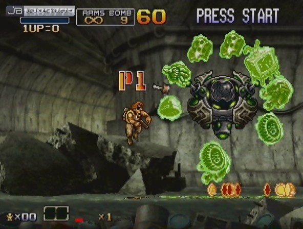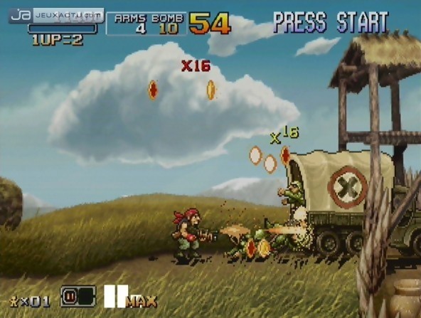 Disponible au Japon et donc en import depuis le 14 septembre dernier, Metal Slug 6 se découvre aujourd'hui à travers cette série de screenshots capturés par nos soins. Nous avons effectivement profité de notre séjour à Tokyo pour récupérer un exemplaire du jeu qui marque un grand changement dans la série. L'arrivée de Clark et Ralf permet d'augmenter le nombre de personnages à 6 et introduit une jauge de vie comme ce fut le cas avec Metal Slug Advance. Il est désormais possible de cumuler les armes, deux maximum, et de switcher de l'une à l'autre via la touche Rond. Mais les nouveautés ne s'arrêtent pas là et on vous en reparle dans notre prochain test import. En attendant, il y a 52 images maison à visionner.