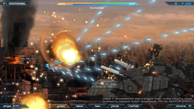 Pour la première fois dans un jeu vidéo, une boutique de vente en ligne s’immiscera dans la production d’un nouveau titre. Play-Asia, fort de son succès sur la toile, investit donc dans un jeu de shoot’em up aussi difficile à prononcer qu’à écrire : Söldner-X : Himmelsstürmer. Développé par SideQuest Studios et édité par Eastasiasoft, le titre n’a pas encore décidé sur quelle(s) plate(s)-forme(s) il sortira. A ce titre, le site officiel du jeu propose à ses visiteurs de donner leur avis et il semblerait que l’opinion publique se porte plutôt sur un jeu Xbox Live Arcade (24,4%), que sur un opus PC (22,6%), un format disque X360 (19,7%), un jeu PlayStation Network (17,3%) ou un Blu-Ray PS3 (16%). Bref, le choix n’est pas encore fait surtout que le jeu vient à peine de dépasser les 35% de son développement. Beaucoup de pourcentages en quelques phrases pour ce shoot’em up qui rendra hommage aux vétérans du genre en puisant ici ou là quelques idées à ses compatriotes qu’il s’agisse des bonus à récupérer, des chaînes à exécuter pour tenter le high-score tout au long des 12 niveaux affichés en résolution 720p. Söldner-X : Himmelsstürmer n’a évidemment pas de date de sortie à l’heure actuelle et il faudra donc patienter encore un peu pour en découvrir davantage malgré cette grosse fournée d’images.