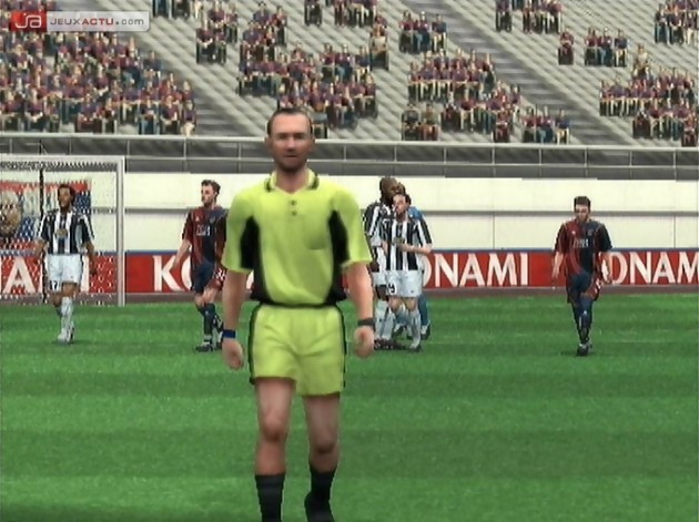 Quelques secondes suffisent pour se rendre compte que désormais les footballeurs ne réagiront plus comme dans PES 4. Une fois la balle aux pieds, il est clair que les courses fougueuses en direction des buts adverses ne seront plus légions. Le joueurs possédant le ballon sera beaucoup plus lent qu’auparavant mais cette baisse de vitesse aura pour conséquence d’améliorer grandement le contrôle. Evitez par conséquent de maintenir le bouton de course (R1) lorsque vous récupérez la balle sinon, vous la pousserez à 3 kilomètres. A moins de se nommer Speedy Gonzalez, votre joueur perdra la balle au détriment de l’équipe adverse. Pensez plutôt à transpercer la défense grâce à vos talents de dribbleur plutôt que de jouer les fins sprinteurs parce que si Pro Evolution Soccer 5 a accentué le contrôle du ballon par rapport aux anciens volets de la série, il a également amélioré le système de défense. Qui n’a jamais pesté à l’époque du Pro Evolution Soccer 4 contre ses défenseurs qui se ruaient toujours à deux sur un seul attaquant permettant ainsi à l’adversaire de se frayer un chemin dans cette satanée brèche. Chaque défenseur réagit en fonction de l’attaque adverse, n’empiétant quasiment jamais sur le travail de son collègue grâce à un large choix de formations et de techniques de jeu. Si auparavant dépasser sur les ailes vous assurez de très belles tentatives de buts de par le fait d’avoir deux joueurs sur soi, pour ce nouveau titre il faudra au préalable se débarrasser de votre double défensif. Le marquage à la culotte est plus que jamais redoutable aussi bien pour l’équipe à domicile que pour les invités. Afin d’offrir un football toujours plus réaliste, Konami s’est appliqué à affiner les fautes. Les obstructions, les tirages de maillots, les poussettes ou bien encore les coups de coudes seront sanctionnés. Bien évidemment, s’il y a avantage, l’arbitre le laissera actif jusqu’à que le coéquipier de l’équipe retouche la balle. Impossible de ralentir son footballeur fautif avant que le logo de l’avantage ne disparaissent, comme ce fut le cas dans Pro Evolution Soccer 4. Mais au final, entre les fautes classiques lors des tacles (désormais, même sur une passe, le joueur qui doit réceptionner le ballon, taclera s’il est en fin de course même si vous appuyez sur Croix ou Triangle) et toutes celles citées précédemment, les matchs sont beaucoup plus hachés et il n’est pas rare d’avoir droit à des arrêts de jeu de 5 à 7 minutes selon l’agressivité des équipes. Si l’arbitre siffle beaucoup (trop même), il a moins tendance à sortir les cartons. Cependant, dans cette version beta, il lui arrive de sortir le jaune alors qu’il avait laissé l’avantage 5 minutes plutôt (temps réel du match). Etrange…