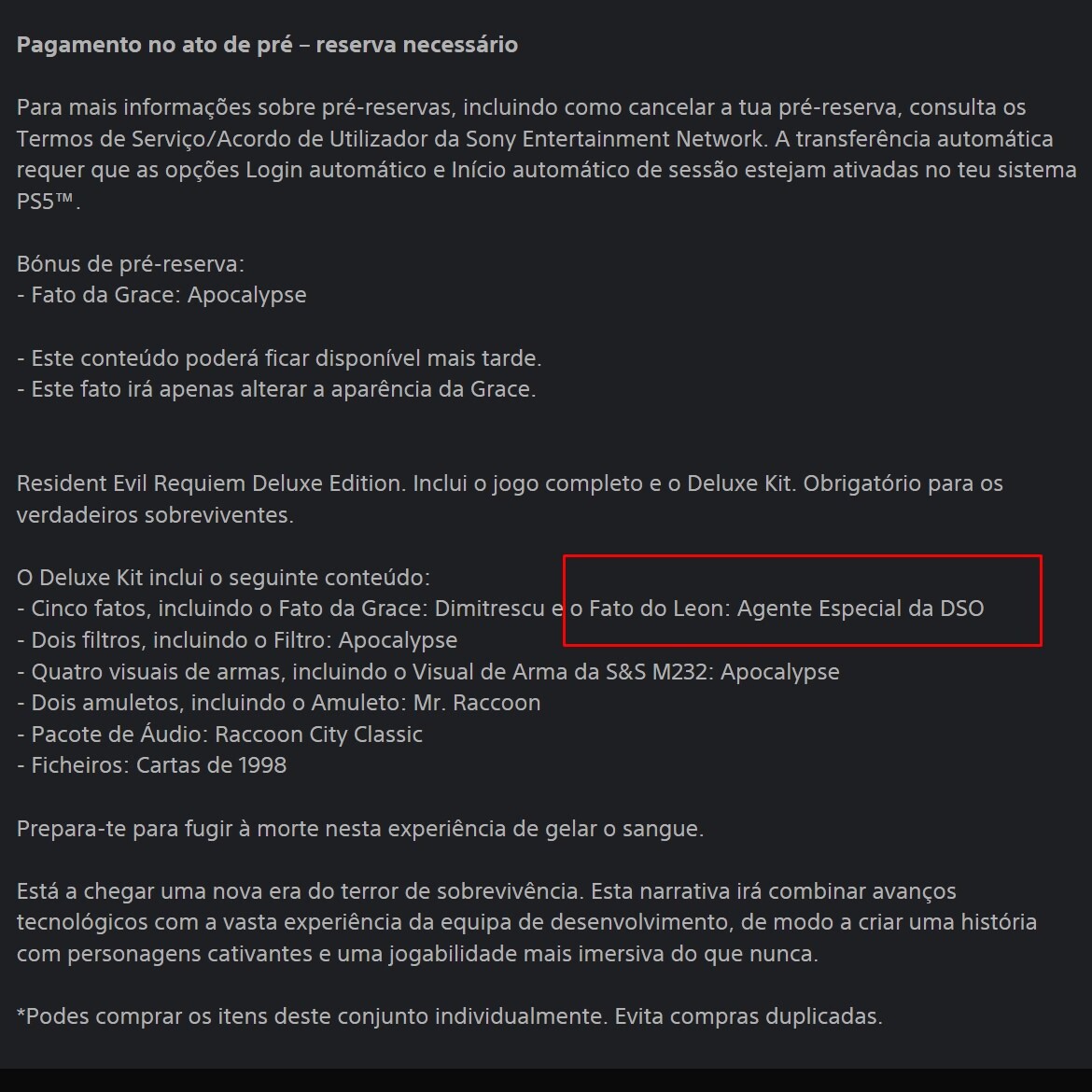 Mais ce qui nous intéresse le plus, c'est la fuite probable de la présence de Leon S. Kennedy, à nouveau sur le tapis. En effet, une fuite sur la page portugaise du PlayStation Store mentionnait un costume DLC pour Leon, avec sa tenue d’agent spécial de Resident Evil 6. Bien que l’information ait été retirée et non confirmée officiellement, elle alimente les spéculations sur le retour du personnage, déjà suggéré par certains trailers et fuites, qui attestent que Leon serait le personnage principal, aux côtés de Grace. On attend de voir, mais de notre côté, on peut aussi vous confirmer la présence du BG blond, on l'a vu de nos propres yeux.