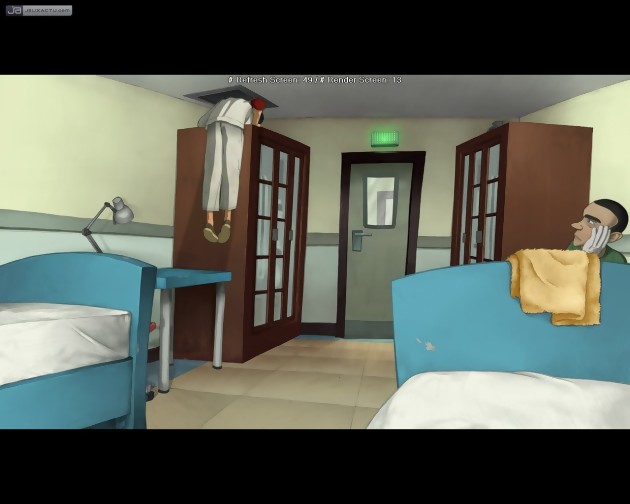 Tout comme ses deux prédécesseurs, ce Runaway assume totalement son statut de bon gros jeu d'aventures classique. Dialogues à choix multiples, ramassages, combinaisons et utilisations d'objets constituent le cœur du gameplay. On n'imaginait pas vraiment qu'il puisse en être autrement, mais cette pré-version nous a également rassurés sur l'ambiance et l'humour du jeu, manifestement à la hauteur de l'excellente réputation de la série. Un exemple parmi tant d'autres (du moins l'espère-t-on) : le chapitre testable se déroule dans un asile psychiatrique où d'inoffensifs excentriques semblent côtoyer des meurtriers sanguinaires. Un choix d'environnement très pertinent pour multiplier les situations loufoques. Votre partenaire de cellule étant un mime contorsionniste, vous vous retrouvez à ranger dans votre inventaire une fleur et une boîte imaginaires. Un peu plus loin, dans la salle de loisirs, une énigme ne peut être résolue qu'en faisant se rencontrer les délires d'un pensionnaire âgé de 103 ans avec ceux d'un doux-dingue quasiment aveugle et muet. Une tâche plus simple que ce que cette succincte description peut laisser penser, mais qui se révèle tout de même nettement plus intéressante que les poncifs du type "passer un journal sous une porte pour récupérer une clé". D'une manière plus générale, les personnages semblent tous posséder une forte personnalité et une bonne dose de charisme. Tous les indicateurs sont donc au vert et l'épisode A Twist of Fate devrait brillamment prolonger la série Runaway. En attendant sa sortie hivernale, voici quelques captures du fameux chapitre 2 que nous avons pu parcourir. La version finale proposera bien évidemment des dialogues en français et sera débarrassée des informations de debug apparaissant en haut de l'écran.