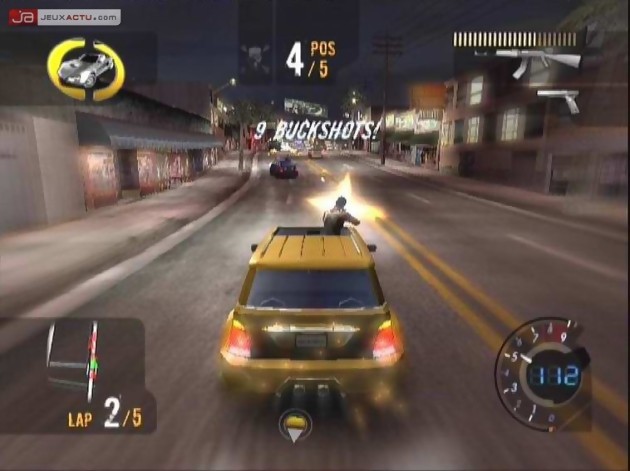 Le mode "Histoire", une guerre de gangsters dans lequel vous aiderez l’apprenti leader Buck à obtenir le respect de ses camarades, consiste en une succession de défis redondants dans des univers urbains nocturnes qui ne le sont pas moins. Certes Ubisoft a tenté de diversifier la soupe en variant les types de véhicules (on passe ainsi de la voiture de sport au pick-up) mais le gros du jeu consiste à dominer ses 5 concurrents en franchissant la ligne d’arrivée en première place. La domination exigée est sans concession, il faut finir premier ou rien ! Pour ce faire, Buck est chargé d’employer la manière forte, ce qui passe par l’utilisation de diverses pétoires disséminées sur le bitume. Un asphalte fort chargé puisque l’on y récole également des boost et autres kits de soins. Un vrai Mario Kart pour racailles ! La comparaison est du reste flatteuse pour le jeu de Ubisoft, lequel se laisse jouer sans heurt particulier, fluidité de l’animation et conduite arcade nerveuse à base de dérapages contrôlés sont au rendez-vous. Ici on ne s’embarrasse pas la tête avec des licences automobiles, et on ne vient pas se perdre dans les méandres du tuning externe ou interne. Chaque véhicule ne dispose que des trois critères vitaux de l’arsouille arcade que sont la vitesse, la maniabilité et la résistance. Partant de là, le choix est vite fait et le fun est instantané.