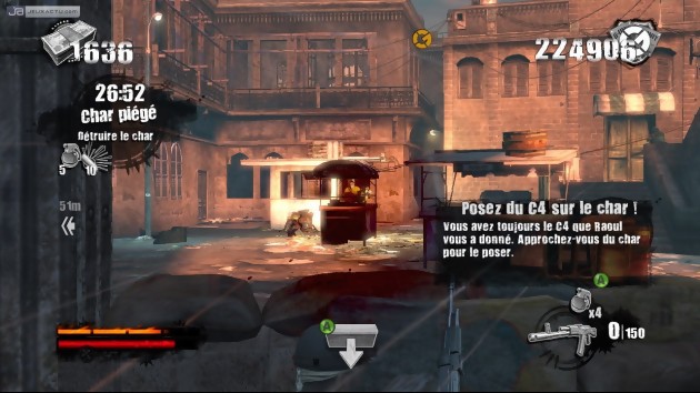 Tout commence d'ailleurs à la sortie d'un concert où notre héros à la casquette de côté vient de se faire ovationner par un public en délire (certainement le gilet pare-balles qu'il porte même en chantant et peut-être même en dormant). Malgré cette reconnaissance, 50 Cent garde les pieds sur Terre et se dirige dans les coulisses pour aller voir l'organisateur du show et lui réclamer son cachet. Un brin cupide le Curtis James Jackson ? Ca ne fait aucun doute. Mais fauché comme les blés, son employeur lui propose en échange de lui donner un crâne incrusté de diamants d'une valeur inestimable. Nos deux hommes trouvent donc un terrain d'entente. Seulement voilà, sur le chemin du retour, son humvee se fait braquer par une bande de pillards qui lui vole - forcément - le précieux objet. Pas content, 50 Cent part à leur trousse, bien décidé à récupérer son dû. Bon, le scénario ne fait pas vraiment dans la finesse et tient sur un confetti mais là n'est pas le propos puisqu'il s'agit d'un prétexte pour justifier quelques heures de joyeuses fusillades. Par ailleurs, pour éviter de réitérer les mêmes erreurs que le premier épisode, 50 Cent : Blood on the Sand a joué la carte de la sûreté et s'est contenté de piller les idées chez les autres. Ceux qui ont joué aux deux Gears of War trouveront de fortes similitudes avec ce dernier puisque Curtis Jackson peut désormais se planquer derrière des éléments du décor lors des fusillades. A l'instar de Marcus Fenix, il peut passer d'une planque à une autre d'un simple mouvement d'épaule, tirer dans le tas histoire de faire du bruit mais aussi franchir des obstacles pour mieux surprendre l'ennemi. Forcément, en recopiant sur le voisin, et a priori le premier de la classe, aucun doute à avoir, le gameplay tient la route. A cela s'ajoute un partenaire que le CPU se chargera de diriger pour ceux qui préfèrent se la jouer solo. En effet, durant toute l'aventure, vous serez accompagné d'un membre de la G-Unit choisi au début parmi Tony Yayo, Lloyd Banks et DH Whoo Kid. À tout moment, un ami peut vous rejoindre en ligne pour en prendre le contrôle. Certains passages nécessitent la collaboration des deux joueurs, comme pour escalader certaines parois ou soulever de lourds rideaux de fer. Rien de bien transcendant, si ce n'est donner la sensation de ne pas évoluer seul dans ces décors souvent en ruines et quelques peu répétitifs, il faut le souligner.