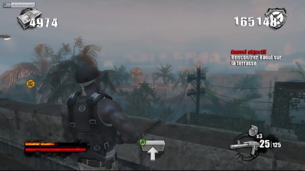 Tout commence d'ailleurs à la sortie d'un concert où notre héros à la casquette de côté vient de se faire ovationner par un public en délire (certainement le gilet pare-balles qu'il porte même en chantant et peut-être même en dormant). Malgré cette reconnaissance, 50 Cent garde les pieds sur Terre et se dirige dans les coulisses pour aller voir l'organisateur du show et lui réclamer son cachet. Un brin cupide le Curtis James Jackson ? Ca ne fait aucun doute. Mais fauché comme les blés, son employeur lui propose en échange de lui donner un crâne incrusté de diamants d'une valeur inestimable. Nos deux hommes trouvent donc un terrain d'entente. Seulement voilà, sur le chemin du retour, son humvee se fait braquer par une bande de pillards qui lui vole - forcément - le précieux objet. Pas content, 50 Cent part à leur trousse, bien décidé à récupérer son dû. Bon, le scénario ne fait pas vraiment dans la finesse et tient sur un confetti mais là n'est pas le propos puisqu'il s'agit d'un prétexte pour justifier quelques heures de joyeuses fusillades. Par ailleurs, pour éviter de réitérer les mêmes erreurs que le premier épisode, 50 Cent : Blood on the Sand a joué la carte de la sûreté et s'est contenté de piller les idées chez les autres. Ceux qui ont joué aux deux Gears of War trouveront de fortes similitudes avec ce dernier puisque Curtis Jackson peut désormais se planquer derrière des éléments du décor lors des fusillades. A l'instar de Marcus Fenix, il peut passer d'une planque à une autre d'un simple mouvement d'épaule, tirer dans le tas histoire de faire du bruit mais aussi franchir des obstacles pour mieux surprendre l'ennemi. Forcément, en recopiant sur le voisin, et a priori le premier de la classe, aucun doute à avoir, le gameplay tient la route. A cela s'ajoute un partenaire que le CPU se chargera de diriger pour ceux qui préfèrent se la jouer solo. En effet, durant toute l'aventure, vous serez accompagné d'un membre de la G-Unit choisi au début parmi Tony Yayo, Lloyd Banks et DH Whoo Kid. À tout moment, un ami peut vous rejoindre en ligne pour en prendre le contrôle. Certains passages nécessitent la collaboration des deux joueurs, comme pour escalader certaines parois ou soulever de lourds rideaux de fer. Rien de bien transcendant, si ce n'est donner la sensation de ne pas évoluer seul dans ces décors souvent en ruines et quelques peu répétitifs, il faut le souligner.