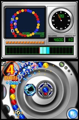 Compulsif donc, comme les Tetris DS, Zoo Keeper et autres Meteos qui ont longtemps frimé après avoir réduit nos neurones en bouillie. Mitchell, déjà à l'origine de Polarium, a conçu comme nouvel instrument de torture Actionloop, le frère jumeau de Zuma pour les acharnés du téléchargement de jeux gratuits sur le net. Le concept du titre n'a pas changé d'un iota : armé du stylet à la place de la souris, le joueur fait face à un serpent multicolore qui avance inlassablement vers le ou les points de chute du niveau. Pour éliminer les perles qui composent le corps du reptile, on doit lancer des billes tout en essayant d'en former au minimum un trio de même couleur. Comme un bon Column à l'ancienne, des réactions en chaîne peuvent être provoquées pour profiter d'une vue un peu plus dégagée. Avec un peu d'entraînement et une bonne maîtrise de la discipline, on arrive à se sortir de situations vraiment désespérées. L'utilisation du stylet se révèle bougrement efficace, avec une précision chirurgicale qui permet de réaliser des jets longue distance sans trembler de la main, que l'on soit droitier ou gaucher. Si Actionloop est loin de se la jouer beau gosse avec des graphismes trop neutres et trop scolaires, sa durée de vie se révèle par contre intéressante avec plusieurs modes de jeu qui permettent de varier les plaisirs. Outre le traditionnel Mode arcade, on bénéficie d'un Mode quête composé d'une soixantaine de levels environ parmi lesquels stages bonus et pseudo bosses sont au rendez-vous, et d'un Mode puzzle où il faudra éliminer toutes les perles d'un serpentin en tout juste trois coups. Adepte du game sharing, le jeu est particulièrement stressant en versus. Même si l'écran supérieur permet de jeter un coup d'oeil rapide chez l'adversaire, on se concentre plutôt sur ses propres perles ; d'autant plus que certains items sortant de l'ordinaire viennent pimenter les parties. L'écran de fumée en soufflant sur le microphone. Chapeau !