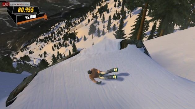 Sans perdre une minute, Amped 3 donne le ton dès ses premières minutes. Menu aux habillages volontairement kitsch ou rétro, descente en costume de lapin rose à la Jackass et rivalités entre bandes de potes ringards, l’ambiance est résolument teenage-attitude et, passée l’incontournable étape de création du personnage jusque là masqué sous de grande oreilles en peluche, c’est à vous et à vous seul qu’incombera très vite la lourde tâche de passer du statut de serial-looser de la région au rang de maître de la glisse. Glisse, tel est bien évidemment le maître mot du jeu, mais ne vous y trompez pas. Si vous passerez le gros de votre temps les chevilles fixées à la planche, vous aurez aussi le droit de grimper sur une motoneige (utile pour remonter les pistes) ou encore de faire glisser vos petites fesses sur tout ce qui pourra s’apparenter de près ou de loin à une luge (saucisse gonflable, pneu de camion, couvercle de poubelle, cheval à bascule et tout objet glissant allégrement sur la neige). A de rares défis prêts utilisant ces nouveaux moyens de transport, ceux-ci seront toutefois vite relayés au rang de gadgets et on rechaussera rapidement notre planche. En effet, alors que les simili luges ne vous serviront qu’à vous exploser littéralement contre tout objet du décor, la motoneige répond, quant à elle, à une physique bien trop fantaisiste pour être pleinement contrôlable et son panel de figure se révèle vite limité. Si ces erreurs de gameplay font retomber à plat le soufflé des quelques nouveautés imposées d’Amped 3, elles ont au moins le mérite de nous rappeler que le titre est avant tout un jeu de planche, et finalement uniquement de planche.