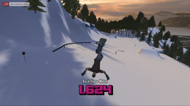Sans perdre une minute, Amped 3 donne le ton dès ses premières minutes. Menu aux habillages volontairement kitsch ou rétro, descente en costume de lapin rose à la Jackass et rivalités entre bandes de potes ringards, l’ambiance est résolument teenage-attitude et, passée l’incontournable étape de création du personnage jusque là masqué sous de grande oreilles en peluche, c’est à vous et à vous seul qu’incombera très vite la lourde tâche de passer du statut de serial-looser de la région au rang de maître de la glisse. Glisse, tel est bien évidemment le maître mot du jeu, mais ne vous y trompez pas. Si vous passerez le gros de votre temps les chevilles fixées à la planche, vous aurez aussi le droit de grimper sur une motoneige (utile pour remonter les pistes) ou encore de faire glisser vos petites fesses sur tout ce qui pourra s’apparenter de près ou de loin à une luge (saucisse gonflable, pneu de camion, couvercle de poubelle, cheval à bascule et tout objet glissant allégrement sur la neige). A de rares défis prêts utilisant ces nouveaux moyens de transport, ceux-ci seront toutefois vite relayés au rang de gadgets et on rechaussera rapidement notre planche. En effet, alors que les simili luges ne vous serviront qu’à vous exploser littéralement contre tout objet du décor, la motoneige répond, quant à elle, à une physique bien trop fantaisiste pour être pleinement contrôlable et son panel de figure se révèle vite limité. Si ces erreurs de gameplay font retomber à plat le soufflé des quelques nouveautés imposées d’Amped 3, elles ont au moins le mérite de nous rappeler que le titre est avant tout un jeu de planche, et finalement uniquement de planche.