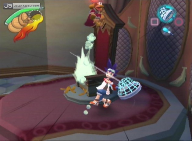 Des singes stupides et rarement insurmontables à attraper, même s’il faut parfois encaisser des contre-attaques musclées, et surtout gare à l’inversement des rôles si l’un de ces primates vous vole le filet à capture ! Et au pire, il est désormais possible de jouer la sécurité en utilisant une capture automatique via les fameuses transformations évoquées plus haut. Le challenge réside donc davantage dans la découverte des ouistitis que dans leur capture. Toutefois et parce qu’il faut bien évoquer la réalisation, si l’on ne se soucie pas spécialement du fait que les graphismes soient très sommaires pour une vétéran comme la PlayStation 2, en revanche le manque d’optimisation du moteur 3D fera bondir les sensibles du frame-rate. Ainsi, les chutes d’animation sont très fréquentes, et le jeu rame pour un oui mais surtout pour un non.