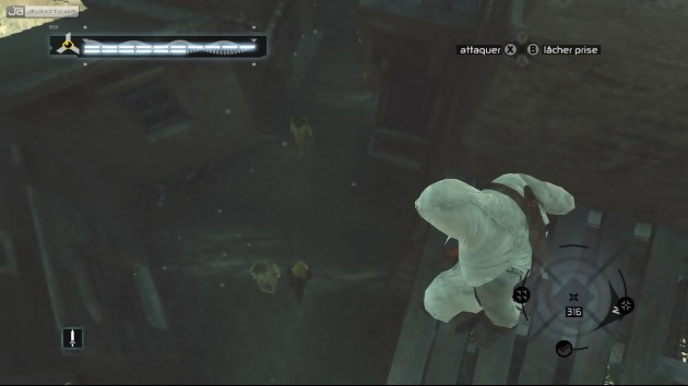 Cela dit, Assassin's Creed n’insiste pas assez sur les changements de rythme, et les affrontements finissent par tous se ressembler. Si l’on connaît une montée d'adrénaline dans les toutes dernières minutes du jeu, c'est uniquement du au grand nombre de guerriers qui nous entourent. Pour avoir un minimum de challenge en one on one, il faut alors aller se frotter aux Templiers, les mêmes que l’on affronte contre Robert de Sablé et Jubar Al-Hakim. En mode passif, Altaïr adopte un tout autre profil qui lui permet d'escalader n'importe quel mur, dompter n'importe quelle corniche en défiant les lois de la gravité. Proche d'un Prince of Persia dans ce domaine, Assassin's Creed autorise de nombreuses acrobaties vitales lorsque l'on se fait poursuivre par des soldats. Par simple gourmandise, on se met alors à provoquer volontairement les gardes pour le plaisir de les distancer en quelques mètres, tellement le toucher du bouton est agréable. C'est simple, Altaïr est capable de tout, ou presque. Grimper une tour, sauter de toit en toit, se rattraper à une corniche en pleine chute, bondir à travers les stands de marchands, se balancer sur les poutres, tout un programme. Là encore, la prise en main est agréable, et il ne faudra pas appuyer systématiquement sur A pour franchir un étage. Une fois accroché à un appui, tout se gère au stick analogique pour un confort de jeu optimisé. La classe. Le fait de devoir jongler manuellement entre les deux profils peut faire débat. Une gestion automatique de la chose aurait forcément subit les sautes d’humeur du CPU, tandis que la gestion manuelle s’avère aussi par moments confuse. En fait, Altaïr peut tenir son épée aussi bien en manuel qu'en auto. Du coup, en mode combat, son épée est sortie du fourreau mais on ne peut pas se protéger des coups des adversaires. Avec une jauge de vie déjà entamée, on perd rapidement connaissance.