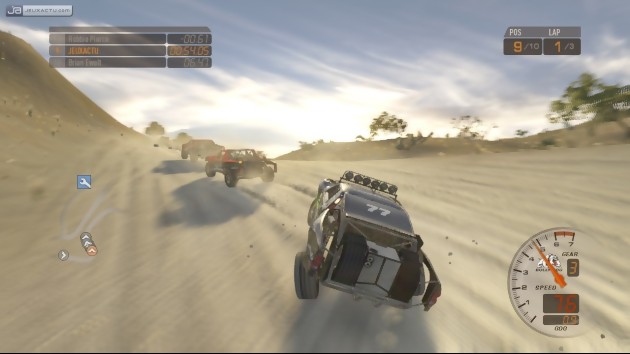 Handicapé par une réalisation sans talent et par-dessus tout obsolète, BAJA : Edge of Control ne parvient pas non plus à nous titiller du côté de sa conduite. Annoncé comme le Gran Turismo du jeu de courses off-road par ses créateurs lors du THQ Gamer's Day, le titre n’offre clairement pas de pilotage réaliste. Le bouton d’accélération enclenché à son maximum et quelques manœuvres à faire avec le stick analogique gauche suffisent à appréhender les virages avec en prime quelques déconvenues. Car si l’orientation arcade n’est en aucun cas dérangeante et rédhibitoire, proposer une conduite cohérente est en revanche indispensable pour rester sur la route. La conduite de BAJA n’est juste ni l’une ni l’autre et encore moins les deux. Les bolides ne restent jamais droits, même en ligne droite, et la moindre bosse, la moindre déformation du terrain envoie votre véhicule valdinguer sur les côtés. Pire encore, les contacts avec les véhicules adverses abiment peut-être la carlingue (avec des pièces qui se détachent comme dans un jeu LEGO) mais n’affectent en rien la conduite. BAJA est donc incohérent de bout en bout, si bien que la curiosité du départ devient une frustration sans bornes. On passe en effet le plus clair de son temps à jongler entre pilotage insensé et comprendre à la fois les bugs techniques (on passe à travers certains éléments du décor et pas d’autres) et le comportement des bolides adverses contrôlés par le CPU. C’est simple, l’intelligence artificielle a été réduite à son strict minimum. Toujours groupés et réagissant souvent de la même manière, les concurrents se content de se suivre comme de sages moutons. Même lorsque certains tracés ouvrent d’autres embranchements, ces derniers ne se lâchent pas d’une semelle, ce qui devient assez pénible à la fin.
