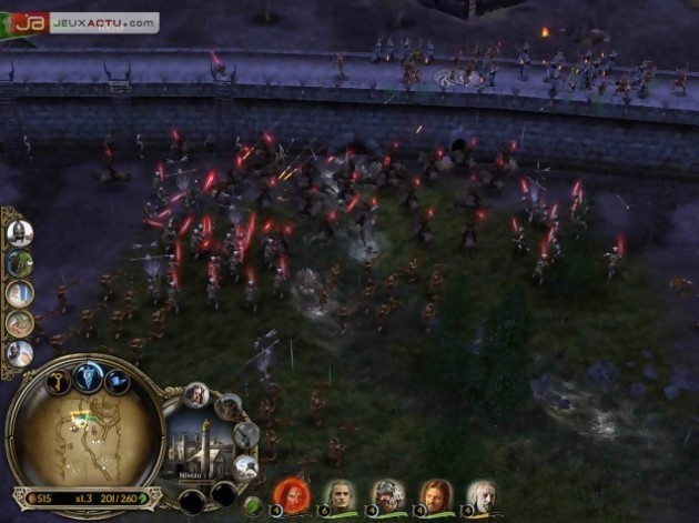 Du côté des forces du mal, les fermes sont remplacées par des scieries, et nécessitent donc d’avoir des paysans pour aller couper du bois. Car, comme vous le savez tous, les orques naissent dans des troncs d’arbres. J’ai beau avoir lu les trois bouquins et vu les trois films, je ne comprends toujours pas pourquoi les orques sont fabriqués grâce à la récolte du bois. Bref, une fois les ressources engrangées, vous pouvez construire des bâtiments militaires, dans lesquels seront produites vos unités de combat. Chacune des quatre formations (Rohan, Gondor, Isengard et Mordor) disposant de ses propres unités et de ses points forts. Les cavaliers du Rohan, les rôdeurs du Gondor, les Ourouk-haï de l’Isengard et les Trolls et les Mûmakils du Mordor. A cela viennent s’ajouter les héros cités plus haut. Chacun des héros grimpe de niveau au fil des combats et est doté de pouvoirs propres. Ainsi, au niveau 4, Gandalf pourra faire appel à Grispoil son cheval, ou invoquer des éclairs pour terrasser des groupes entiers d’ennemis. Aragorn, grâce à son charisme élevé, pourra motiver les troupes alliées et leur donner des bonus d’attaque. Gimli pourra faire tournoyer sa hache et faire trembler le sol, alors que Legolas pourra lancer des flèches puissantes et entraîner les unités d’archers pour leur faire gagner de l’expérience. Comme les héros, les bataillons peuvent également gagner de l’expérience allant de un à dix. Un bataillon de niveau dix étant beaucoup plus puissant et résistant qu’un bataillon venant de sortir de la caserne.