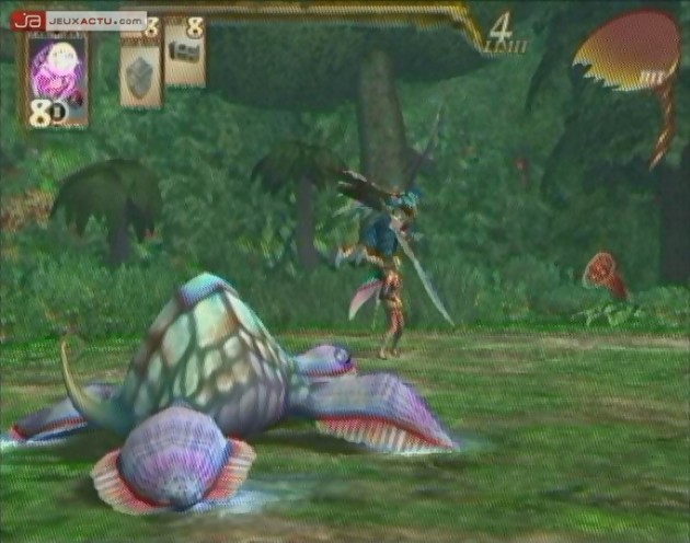 Vous l’aurez compris, on n’est pas au bout de nos surprises lorsqu’on joue à Baten Kaitos, d’autant plus qu’afin d’éviter les temps morts, notamment en phase défensive, il faut sélectionner les Magnus juste avant l’attaque ennemie en une fraction de seconde. Il convient donc d’être constamment attentif et sur le qui-vive ! Si vous pensiez vous retrouvez face-à-face avec un clone de Yu-Gi-Oh au gameplay soporifique, passez votre chemin. A la fin de chaque combat, vous gagnerez, comme dans tous les jeux de rôle, de l’expérience. Cependant, l’évolution n’est pas immédiate. Il faudra vous rendre à l’Eglise via un point de sauvegarde pour progresser. Lorsque vous gagnez des niveaux, vos points de vie et vos compétences au combat augmentent. Vous pouvez également grimper en Classe ce qui vous octroiera un deck plus important et la possibilité de choisir plus de Magnus pendant les duels. A cette originalité de jeu, il faut rajouter une réalisation tout bonnement spectaculaire. Même si la modélisation des personnages est assez quelconque, voire dépassée, les décors sont d’une beauté à pleurer et on s’émerveille à chaque voyage. Et lorsque ce ne sont pas les paysages qui nous bluffent, ce sont les scènes cinématiques qui nous scotchent à notre pad. Il en est tout autant pour les mélodies enchanteresses signées Motoi Sakuraba qui bercent l’exploration et qui savent être très rock lors des combats. Un petit bémol pourrait être formulé au sujet du traitement des voix, elles hurlent perpétuellement le nom des attaques durant les combats, ce qui devient rapidement très agaçant ! Fort heureusement, Namco a pensé à tout avec la possibilité de les désactiver en passant par le menu des options. Une nouvelle fois, l’éditeur a préféré laissé les voix en anglais et le résultat est plutôt payant car bon nombre de personnages possèdent leurs voix propres. Si vous vous inquiétez au sujet de la durée de vie du soft, rassurez-vous, entre la trame principale et la foultitude de mini quêtes, le jeu n’est pas prêt de prendre la poussière.