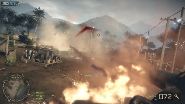 Toute cette mise en scène intervient sur les cinq nouvelles cartes disponibles : Base stratégique, Colline 137, Temple de Cao Son, Vallée de Phu Bai et Opération Hastings. Cette dernière a la particularité de ne pas être disponible d'emblée, puisqu'il faut que les joueurs de chaque plateforme (PC, PS3, Xbox 360) effectuent 69 000 000 d'actions d'équipe (soin d'un coéquipier, réparation de véhicules, distribution de munitions...) pour la débloquer. Dans leur ensemble, les cinq cartes offrent de jolis paysages de rizières, de ruines asiatiques, de forêts en feu, de cabanes en bois... Mais c'est surtout leur agencement qui force l'admiration. On peut certes leur reprocher d'être un poil trop petites, mais chacune d'entre elles permet aux véhicules comme à l'infanterie de trouver plusieurs chemins pour atteindre les objectifs. Sans pour autant négliger les goulots d'étranglement qui favorisent les combats rapprochés. Il faut dire que l'équipement militaire des années 60 ne peut décemment rivaliser avec l'arsenal high-tech du Battlefield : Bad Company 2 original. Du coup, il est plus difficile de réaliser des tirs à très grande distance, même si les fusils sniper répondent heureusement à l'appel. La vraie nouveauté en ce qui concerne les armes provient du lance-flammes, qui fait son petit effet. Sa portée est très réduite mais quiconque saura s'approcher discrètement d'un groupe de deux ou trois tireurs d'élite se croyant à l'abri au milieu des fougères ne regrettera pas d'avoir choisi un tel équipement. Au final, ce DLC n'apporte rien de révolutionnaire ni de génial, ni même d’extrêmement consistant, mais il fait très bien son job et promet des dizaines d'heures d'amusement supplémentaires.