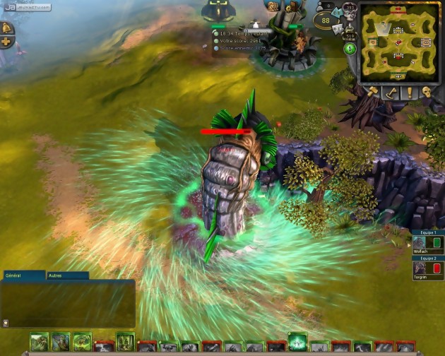 Etant donné le caractère relativement original du jeu, commençons par en détailler les principes fondamentaux. Basées sur des mécaniques classiques de stratégie temps réel, les parties s'affranchissent quasiment de toute construction de base. Des puits énergétiques sont disponibles à différents endroits de chaque map, il suffit donc de les capturer pour s'assurer un flot constant d'énergie. Même règle pour les monuments, qui permettent, eux, de créer des orbes appartenant à l'un ou l'autre des quatre éléments fondamentaux (feu, glace, nature, ombre). Chaque unité demande une certaine quantité d'énergie et un nombre donné d'orbes pour pouvoir être invoquées. Car oui, il ne s'agit pas d'entraîner ou de construire ses troupes, mais bel et bien de les faire apparaître instantanément sur le champ de bataille. Près d'un monument ou d'un puits, auquel cas elles sont directement en pleine forme, ou près d'une unité alliée où qu'elle soit sur la carte, le cas échéant, les nouvelles troupes souffrent du mal d'invocation qui limite leurs points de vie et leurs pouvoirs pendant quelques secondes. Forts de ces principes, les affrontements sont extrêmement dynamiques et BattleForge s'avère incontestablement plus nerveux et dynamique que le RTS moyen. La plupart du temps, les premiers affrontements avec les troupes adverses interviennent en moins d'une minute et ce, que l'on joue contre l'ordinateur ou contre un adversaire humain. Puisque BattleForge exige d'être connecté à un serveur en permanence, on évitera de parler de mode solo, même pour les maps qui se jouent seul. Nous utiliserons plutôt le terme PvE (joueur contre environnement), à mettre en rapport avec le célèbre PvP (joueurs contre joueurs) des MMORPG. Ici, le PvP prend la forme de duels (un contre un) ou de PvP par équipe (2 contre 2).