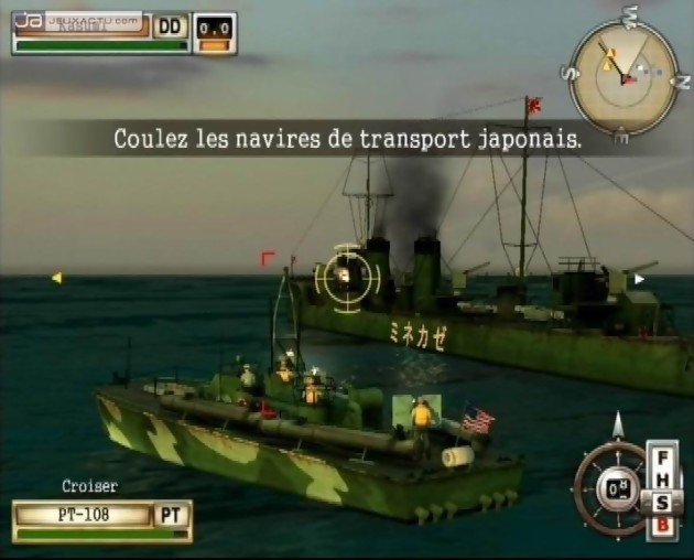 Avec plus de 60 appareils aériens ou navals à contrôler, un petit tour du côté du mode "tutorial" s’impose surtout que Battlestations : Midway cache bien son jeu avec son aspect doucement stratégique occulté par une campagne de promotion mettant l’accent sur un gameplay résolument arcade. Et lorsque je dis "un petit tour", comprenez par là plus de trois quarts d’heure à engranger un maximum d’informations. Et comme à l’école, ça rentre par une oreille et ça ressort par l’autre même avec la plus grande attention. Quelle en est la raison ? Assurément à trop vouloir en faire, les développeurs n’ont pas trouvé un gameplay homogène, ce qui signifie que les configurations des boutons et les actions réalisables seront différentes que vous pilotiez un FAF Wildcat, dirigiez un PT Boat ou manoeuvriez un sous-marins. On commencera donc doucement en se familiarisant avec le gouvernail d’un bateau. Dans la majorité des cas, le stick analogique gauche gère la vitesse d’un appareil grâce aux directions haut et bas tandis que la gauche ou la droite déplaceront l’engin. Au contraire, le second stick peut avoir deux fonctions différentes soit le contrôle de l’angle de vue pour les bateaux et les sous-marins, soit les séquences de voltiges en plein air. Une fois les bases bien acquises, l’heure est à l’utilisation de l’artillerie. Du fait des nombreux appareils disponibles, l’arsenal augmente en nombre : canons d’artillerie, canons antiaérien (AA), grenades sous-marines ou encore torpilles. Il va sans dire que tous les bâtiments ne proposent pas le même équipement ni la même façon d’attaquer. De plus cet entraînement offensif met l’accent sur les avantages et les inconvénients d’un type d’armes de sa vitesse de rechargement, à sa visée. Afin de vous faciliter la tâche, un jeu de couleurs à l’écran affiche les caractéristiques techniques de l’arme sélectionnée car il faut savoir que votre arsenal ne propose pas des munitions illimitées et ni une invulnérabilité totale aux tirs ennemis. Il faudra parfois rebrousser chemin pour se réapprovisionner ou ouvrir le panneau de réparation afin de limiter les dégâts.