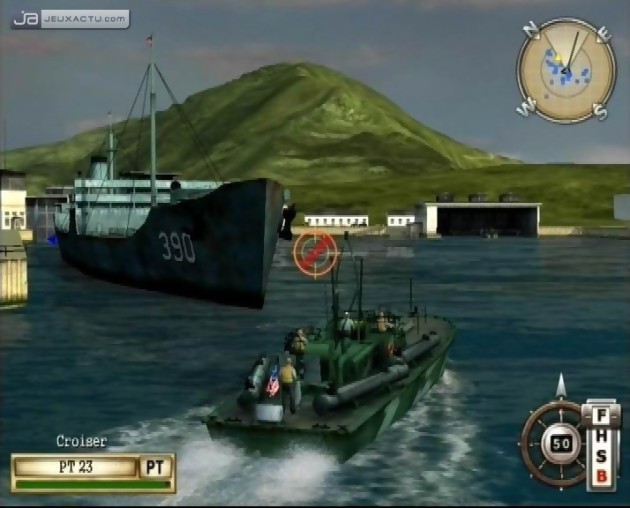 Avec plus de 60 appareils aériens ou navals à contrôler, un petit tour du côté du mode "tutorial" s’impose surtout que Battlestations : Midway cache bien son jeu avec son aspect doucement stratégique occulté par une campagne de promotion mettant l’accent sur un gameplay résolument arcade. Et lorsque je dis "un petit tour", comprenez par là plus de trois quarts d’heure à engranger un maximum d’informations. Et comme à l’école, ça rentre par une oreille et ça ressort par l’autre même avec la plus grande attention. Quelle en est la raison ? Assurément à trop vouloir en faire, les développeurs n’ont pas trouvé un gameplay homogène, ce qui signifie que les configurations des boutons et les actions réalisables seront différentes que vous pilotiez un FAF Wildcat, dirigiez un PT Boat ou manoeuvriez un sous-marins. On commencera donc doucement en se familiarisant avec le gouvernail d’un bateau. Dans la majorité des cas, le stick analogique gauche gère la vitesse d’un appareil grâce aux directions haut et bas tandis que la gauche ou la droite déplaceront l’engin. Au contraire, le second stick peut avoir deux fonctions différentes soit le contrôle de l’angle de vue pour les bateaux et les sous-marins, soit les séquences de voltiges en plein air. Une fois les bases bien acquises, l’heure est à l’utilisation de l’artillerie. Du fait des nombreux appareils disponibles, l’arsenal augmente en nombre : canons d’artillerie, canons antiaérien (AA), grenades sous-marines ou encore torpilles. Il va sans dire que tous les bâtiments ne proposent pas le même équipement ni la même façon d’attaquer. De plus cet entraînement offensif met l’accent sur les avantages et les inconvénients d’un type d’armes de sa vitesse de rechargement, à sa visée. Afin de vous faciliter la tâche, un jeu de couleurs à l’écran affiche les caractéristiques techniques de l’arme sélectionnée car il faut savoir que votre arsenal ne propose pas des munitions illimitées et ni une invulnérabilité totale aux tirs ennemis. Il faudra parfois rebrousser chemin pour se réapprovisionner ou ouvrir le panneau de réparation afin de limiter les dégâts.