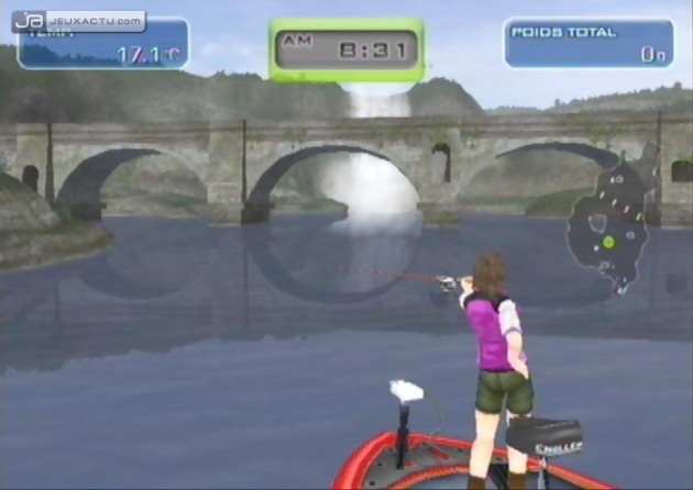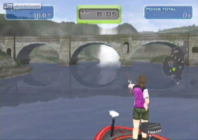 Car il faut reconnaître que les poissons se font plutôt capricieux dans Big Catch Bass Fishing, même en sillonnant les endroits les plus peuplés. Pour faire dans la subtilité, le joueur dispose de plusieurs lancers - par-dessus, de coté, en revers, en pitching -, ainsi que de plusieurs leurres - surface, moyen, profondeur, fond - pour attraper toutes sortes de poissons. Le problème c'est que la reconnaissance de mouvements est à la rue, et lancer sa ligne dans l'eau devient rapidement un calvaire ; d'autant plus que le fait de devoir presser, puis relâcher A en mimant le geste n'est pas une idée lumineuse. Big Catch Bass Fishing peut être taquiné avec la Wiimote seule, ou couplée au Nunchuck, ce dernier servant dans ce cas à enrouler sa ligne. Lorsqu'un poisson mord à l'hameçon, il faut donner un coup de poignet pour engager le combat. Des talents de pêcheur ne sont absolument pas requis, à partir du moment où l'on suit correctement les indications - gauche, droite, haut, bas - qui s'affichent à l'écran, tout en moulinant astucieusement sa ligne. La couleur de la canne - bleue, jaune, rouge - renseigne sur la résistance du poisson, avec le risque de voir sa ligne casser si on n'adopte pas le bon geste au bon moment. En fait, il faut essayer de suivre le mouvement du poisson tout en le ramenant intelligemment vers la barque. Rien de sorcier. Pour habiller un peu le tout, Big Catch Bass Fishing nous propose de visiter plusieurs endroits - cascade, barrage, cabane, rochers... - où les poissons sont censés se réunir, avec la possibilité de sélectionner les conditions climatiques, l'heure de la journée, et même la saison. Pêche sportive oblige, un mode Tournoi est de mise, et le vainqueur est celui qui réussit à attraper les poissons les plus lourds. Un système de classe à également été mis en place, afin de différencier les newbies des killers. Enfin, la connexion Wi-Fi permet jusqu'à quatre joueurs de s'affronter en ligne, un bonus que certains ne goûteront même pas. Quant à la laideur de la réalisation, elle se passe de commentaire.