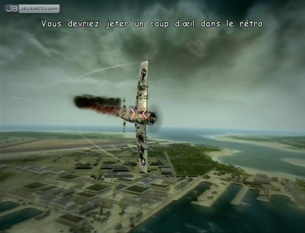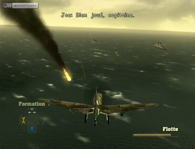 Pas besoin de speech pour mettre en scène les dogfights qui vous attendent dans Blazing Angels : Squadrons of WWII. La seule petite chose que l’on peut dire concernant votre escadron, c’est que vous êtes un peu les Frères d’Armes des cieux. A bord de votre coucou, vous ne serez jamais seul face à l’ennemi mais combattrez aux côtés de trois autres soldats américains : Joe, Frank et Tom. Et comme vous pouvez vous en douter chacun possède des compétences spéciales que vous apprendrez à utiliser dès les premières missions. Via la croix multidirectionnelle de la manette, vous pourrez ordonner à vos hommes de modifier leurs attitudes au combat. Par défaut, ils volent en formation à vos côtés mais cette pratique n’est guère payante sous le feu ennemi car il sera beaucoup plus difficile de viser les avions adversaires sans shooter ses collègues. C’est pourquoi vous pouvez les envoyer au charbon en basculant en Mode Attaque. Dès lors, ils attaqueront les cibles ennemies afin de faire un maximum de dégâts. Mais pour certaines missions nécessitant de défendre une base militaire ou des bombardiers en plein vol, vous devrez valider le Mode Défensif. Vos confrères se chargeront alors d’éliminer les avions représentants un risque pour la mission. Mais là n’est pas leurs compétences spéciales citées plus haut. Dans le cas de Joe, il sera d’une aide importante au cours des missions. Si votre Spitfire ou votre P51 Mustang commence à sentir le roussi, vous pourrez lui demander de réparer votre avion en appuyant sur la direction gauche du D-pad. Vous devrez alors suivre une combinaison de boutons à l’écran pour que notre réparateur de service parvienne à restaurer comme par magie votre appareil en plein vol. Tom a un rôle beaucoup plus défensif. Grâce à sa manœuvre Taran, il pourra vous débarrasser des gêneurs gaspillant leurs balles dans votre sillage. Enfin, Frank, le leader du trio, fera moins dans la finesse que ses coéquipiers avec une attaque qui détruira une cible désignée ainsi que tous les avions regroupés en formation autour de cette proie.