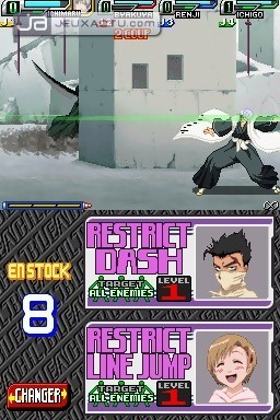 Heureusement, pour contrecarrer ces déficiences de gameplay, Treasure a mis en place tout un système de trucs et astuces pour ne pas se laisser déborder. Outre le fait que les attaques sortent avec une certaine aisance via la croix directionnelle minuscule de la DS, le jeu autorise les Shunpô, des téléportations qui permettent de disparaître et de se retrouver dans le dos de son adversaire. Evidemment, pour éviter tout abus, une jauge de force spirituelle est nécessaire pour exécuter une telle technique. Selon le personnage sélectionné, la façon de se déplacer varie, ce qui permettra de se faire une petite liste de favoris parmi ces héros. Evidemment, comme tout bon jeu de baston qui se respecte, Bleach : The Blade of Fate fait l’éloge des furies, associée à une jauge bien précise. Plusieurs niveaux de furie sont disponibles et en fonction du niveau de la jauge, les dégâts ne sont pas les mêmes, il y va de soi. En sus de toutes ces subtilités, Bleach : The Blade of Fate fait partie de ces jeux où l’utilisation de cartes permettent d’engendrer bonus et malus en fonction de leur pouvoir assigné. Cela va de la possibilité de réaliser pendant un cours laps de temps autant de furies qu’on le souhaite à la restriction de saut, une limitation des dégâts encaissés ou bien encore l’impossibilité de passer sur le second plan. Des cartes à paramétrer avant chaque début de match, accessibles soit en évoluant dans le mode "Scénario", soit en les achetant à la boutique "Urahara". Sympathique dans l’approche, la fonction de ces cartes reste, il faut bien l’avouer, un simple gimmick pour justifier l’utilisation de l’écran tactile de la DS, les pros du quart de cercle préférant se focaliser sur l’enchaînement des combos, sans user d’artifices farfelus. En se voulant accessible pour tous et en jouant sur deux tableaux, celui du jeu de baston traditionnel et du jeu de combat ouvert façon Smash Bros., Bleach : The Blade of Fate ne sait pas trop sur quel pied danser. Assez efficace car disposant d'un gameplay bien pensé, le jeu de Treasure manque encore de finition pour être considéré comme l’une de ces stars de la baston 2D. Car dans notre monde, l’exigence est évidemment de mise.