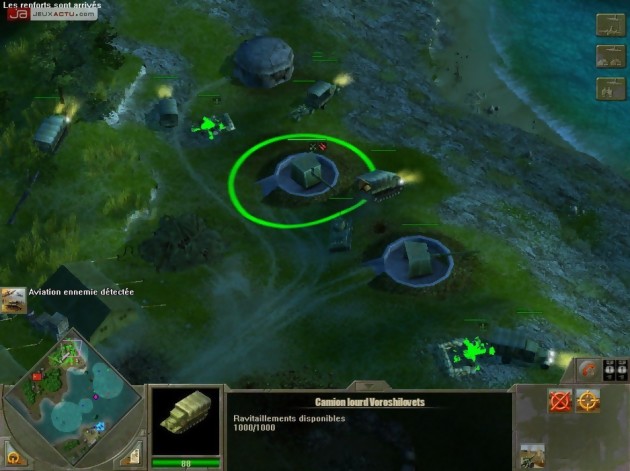 Faire preuve d'astuces et de stratégie sera un impératif pour pouvoir briller sur le champ de bataille et surtout minimiser ses pertes dans un premier temps. La configuration des unités reposant un peu sur le principe du pierre-papier-ciseaux, connaître les forces et les faiblesses de chacune de ses unités et celle de son adversaire sera un atout non négligeable pour influer sur le cours d'une bataille et la ligne directrice du tutorial va d'ailleurs dans ce sens. Si le bourrinage marchera sans doute dans un premier temps, on se rend très vite compte que ce n'est pas la technique la plus appropriée pour sauvegarder la vie de ses hommes. En effet, la collecte de ressource et la production de ses propres bâtiments / unités est bannie du concept du jeu tant et si bien qu'il faudra résolument faire avec les moyens du bord. Par contre, il n'est plus possible de remplacer ses pertes comme dans le précédent opus mais plutôt de faire appel épisodiquement à des renforts militaires. Ainsi, on pourra obtenir un soutien aérien ou alors de nouvelles unités se mettront sous votre commandement. De même, on ne peut pas non plus prodiguer des soins à ses hommes mais les troupes du génie sont heureusement capables de réparer les unités mécaniques. L'infanterie sera également à même de prendre position dans un bâtiment ou de capturer les pièces d'artillerie adverse. Blitzkrieg 2 offre donc des possibilités d'action très large et il convient de maitriser toutes ces fonctionnalités pour affiner une nouvelle stratégie à chaque situation en prenant également en compte des troupes fournies mais également du climat et de l'environnement. On pourra par exemple explorer la carte à l'aide d'un avion de reconnaissance et harceler l'ennemi avec des pièces d'artillerie de longue portée, retrancher son infanterie mobile et les camoufler afin de tendre une embuscade, creuser une tranchée, donner des directives d'attitudes (tenir une position, patrouiller, etc.) ou de formations de combat. De même, il faudra également penser à ravitailler en munitions votre troupe à partir de votre dépôt pour ne pas se retrouver en pénurie en plein dans le cœur de l'action.