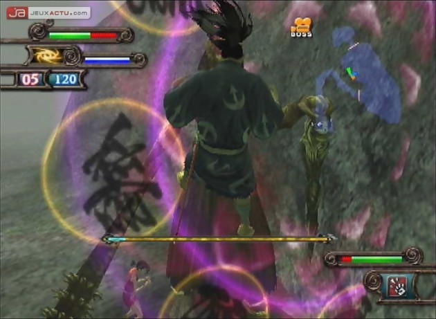 Tout ceci confère un caractère évolutif propre au RPG qui n’est pas désagréable. De son côté, Dororo dispose de plusieurs armes de lancer toutefois moins efficaces qu’un bon corps à corps. De ce point de vue, on déplorera que la chétive Dororo arrive à éliminer, presque aussi facilement que Hyakkimaru, toutes sortes de démons sanguinaires à l’aide de ses petits poings. On aurait pu imaginer deux types de gameplay bien distincts entre les phases du samouraï et celles de la voleuse, de même qu’une meilleure complémentarité. Les deux compères s’entraident, certes, mais toutes les séquences sont scriptées à l’avance, le joueur n’a pas le loisir de permuter quand il le désire entre les deux personnages. Il en résulte une progression assez facile, ce qui n’est pas forcément un mal pour les joueurs qui désirent faire la part belle à l’action plutôt qu’à la recherche. Les puzzles sont ainsi peu nombreux et très simples, en revanche les ennemis seront légion sur votre chemin ! Ca tombe bien, Hyakkimaru se révèle, une fois toutes ses aptitudes en poche, d’une efficacité hors du commun. Foncer contre une troupe de démons tout en tailladant avec hargne et efficacité est un jeu d’enfant. Le personnage répond très bien à vos sollicitations, et se révèle vif et rapide, passé un léger temps d'adaptation. Seule la visée avec la jambe-canon est d’autant plus agaçante que les munitions sont très limitées. En outre, avec une seule barre de vie à sa disposition, on commence à avoir un peu peur devant le manque flagrant d'objets de soins et autres munitions. En réalité, le jeu regorge de bonus de ce genre, mais il faut les obtenir à la sueur de son front. Je m'explique, Hyakkimaru dispose d’une attaque spéciale, en chargeant et en relâchant le bouton triangle, qui permet de démarrer une série de combo en un temps limité. Placez un maximum de touches suivant les indications à l’écran, en l’achevant avec le bouton triangle, et l’ennemi disparaîtra en laissant derrière lui moult portions de riz et autres boulets de canon. Une technique à ne surtout pas négliger sous peine de se retrouver bien vite désarmé face aux innombrables Boss qui parsèment le jeu.