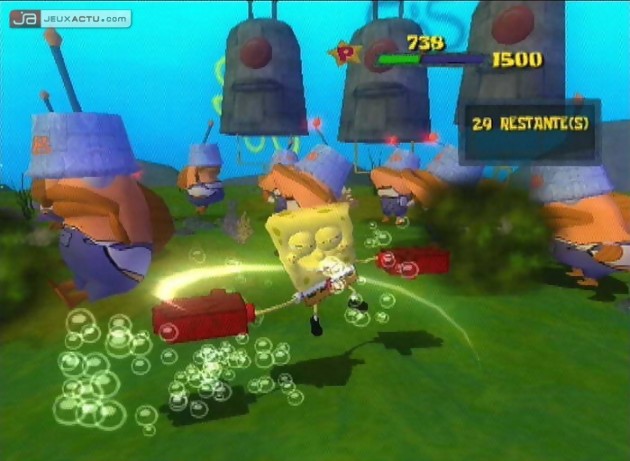 Les 18 niveaux que présente Bob l’Eponge : le Film sont découpés en plusieurs défis qu’il faudra souvent revisiter afin de débloquer les jetons Goofy Goober qui serviront à débloquer des nouveaux mondes et des attaques inédites. Même si la progression est assez facile, la difficulté n’étant pas trop au rendez-vous, il faudra parfois revenir en arrière et réussir une course chrono ou une arène pour remporter les précieuses pièces. Sans être aussi long qu’un Jak III, Bob l’Eponge : le Film saura contenter un peu tout le monde à condition d’accrocher à l’univers de Bob. Voilà peut-être le point sensible de Bob l’Eponge : le Film ou de toutes autres productions estampillées de ce corps spongieux. En résumé et pour reprendre un leitmotiv des Inconnus : « c’est cul-cul, c’est con-con, c’est bêbête et c’est débile ». C’est la marque de fabrique de Bob l’Eponge ! On aime ou on n’aime pas ! L’humour omniprésent de la série, et du film, est au rendez-vous ici aussi à travers les actions des personnages et les dialogues in-game ou dans les menus. La fidélité du jeu par rapport au dessin animé ne s’arrête pas là puisque même graphiquement on nage en plein Bikini Bottom/Shell City. Coloré mais épuré, Bob l’Eponge : le Film ne brille sans doute pas par ses graphismes (au même titre qu’un jeu inspiré des Simpsons ou de South Park) mais une fois de plus séduira les fans de la série.