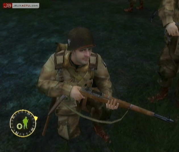 En plus de se démarquer de la concurrence grâce à une formidable mise en abîme, la série Brothers in Arms a détourné l’aspect FPS militaire sur console en proposant un système de jeu stratégique, évitant ainsi de tomber dans le shoot bourrin caractérisant certaines sagas sur le déclin. Si, tout au long du jeu, vous incarnez le Sergent Joe Hartsock, ce sont bien évidemment les hommes qui vous suivent qui tiennent un rôle prépondérant dans le déroulement des opérations. N’imaginez galoper tel un coq en patte dans la campagne normande, fusillant de votre Thompson les soldats nazis se pointant dans votre viseur, sinon votre nom ornera le monument aux morts du patelin dans lequel vous avez courageusement fait face à l’ennemi. Dans Brothers in Arms : Earned in Blood, vous apprendrez les tactiques militaires employées par les libérateurs de la France à travers l’utilisation de l’équipe d’appui-feu et de l’équipe d’assaut. Travaillant en binôme, ces deux escouades s’avèrent particulièrement efficaces lors de situations critiques, quand vous ne pouvez traverser un village sans risquer de perdre l’un de vos camarades à cause d’un groupe d’Allemands particulièrement bien organisés. A ce moment-là, il conviendra d’ouvrir le feu sur ces hommes avec une équipe pendant que vous déplacez vos coéquipiers vers une zone moins dégagée. Les tirs de couverture obligeront vos ennemis à se retrancher, bien à l’abri des balles en attendant une opportunité de vous faire la peau. Ce petit jeu de cache-cache est signalé à l’écran à l’aide d’icônes. Le rouge signifie que vous avez identifié le danger et que vous connaissez la position des Allemands et que ces derniers vous le rendent bien grâce à un feu nourri. Mais lorsque vos camarades tireront sur les hommes d’Hitler, l’icône rouge se muera en cercle gris annonçant un temps de répit des hostilités. A ce moment-là, c’est à vous de jouer grâce à une manœuvre de contournement afin de prendre à revers les Boches, comme on les appelait à l’époque.