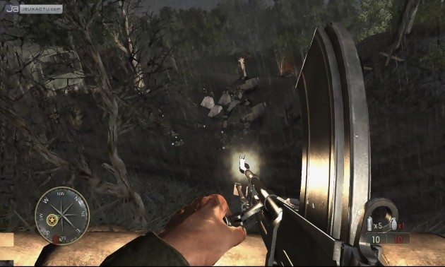 Sur ce point, Call of Duty 3 : En Marche vers Paris ne faillit pas à la réputation de la série ; et le joueur qui aura déboursé 70 € aura de quoi s’émerveiller sur les séquences de bravoure et de combat qui s’enchaînent à tour de bras. Explosions à tire-larigot, ennemis qui hurlent comme des sauvages dans la langue de Goethe, balles qui fusent de part et d’autre et qui ricochent parfois sur le casque, les développeurs ont accéléré la cadence par rapport au dernier épisode, à défaut de grandes nouveautés. C’est d’ailleurs un point sur lequel on peut pas trop accabler Call of Duty 3 : En Marche vers Paris qui mise donc une fois encore sur une mise en scène spectaculaire et cinématographique. L’aspect technique a été revu à la hausse et on ne se loupera pas en disant que Call of Duty 3 : En Marche vers Paris est plus beau que son prédécesseur. Il suffit de voir par exemple la modélisation des personnages, bien plus convaincantes que par le passé, notamment au niveau des uniformes qui comportent bon nombre de plis. On est loin d’un Gears of War mais dans l’ensemble, le titre reste très plaisant à regarder et peut dignement faire partie de la famille des jeux next gen’. Les décors ont également été le fruit d’un travail de qualité avec des environnements qui fourmillent de détails et d’animations. Contempler ces champs d’herbe et ces branches d’arbres se plisser au gré du vent est un spectacle saisissant. En parlant de vent, les développeurs avaient énormément mis l’accent sur le fait que cet élément naturel avait un rôle déterminant dans le jeu, dans la mesure où il servait à dissiper plus rapidement un écran de fumé créé par une grenade fumigène. Il faut croire que Treyarch nous a bien baratiné car à aucun moment, cet élément apparaît dans le jeu…