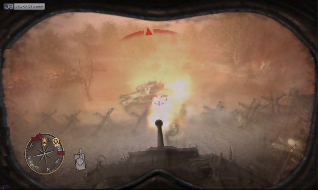Le close combat batte action n’est pas le seul aspect interactif qui a été ajouté dans Call of Duty 3 : En Marche vers Paris. Désormais, le joueur a davantage le sentiment de participer à cette guerre atroce, grâce à la mise en scène de nouvelles actions. Poser un détonateur sur un tank ou canon anti-aérien ne se fait plus seulement en appuyant sur une simple touche. Il va falloir se montrer un peu plus habile avec les touches et autres sticks analogiques de la manette pour réussir la manœuvre. Expliquez comme ça, on a l’impression qu’il s’agit d’une révolution. Sans vouloir créer de fausse joie, sachez que là aussi l’interaction est limitée mais surtout répétitive. Autrement, on note l’introduction de phases motorisées, en jeep et en tank. Ce n’est pas une première pour la série et encore moins pour le genre mais dans Call of Duty 3, le joueur ne se contente plus de tirer à partir d’une mitraillette, d’ailleurs, il ne le fait qu’une seule fois et pendant un court moment. Non, désormais, c’est en tant que conducteur qu’il va falloir se montrer à la hauteur. Deux vues sont possibles : première et troisième personne. La première vue – celle par défaut – permet une immersion plus grande mais les différents chemins possibles nous empêchent d’avoir une grande visibilité. C’est pourquoi en cliquant sur le stick analogique droit, il est possible d’avoir une vue plus ample mais surtout plus cheap. Les personnages nous donnent l’impression d’être des marionnettes désarticulées et le pilotage du véhicule est tout bonnement cheap à souhait, avec une physique de la jeep assez pitoyable. A l’inverse, les séquences en tank sont plus intéressantes avec là aussi deux vues disponibles. Peu importe, ce n’est pas vraiment sur cet aspect que mise Call of Duty 3, même si le but est tout de même d’approfondir le sentiment d’immersion.