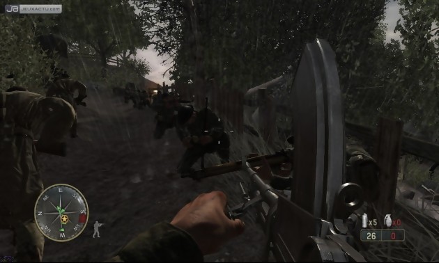 En revanche, ce qui n’a pas changé dans Call of Duty 3 : En Marche vers Paris, c’est bien la gestion des coéquipiers et de l’intelligence artificielle des ennemis. La série n’a jamais été une référence en matière d’I.A. et ce n’est pas Call of Duty 3 qui viendra déroger à la règle. Les Allemands foncent toujours tête baissée et mettent souvent du temps à appuyer sur la gâchette. Le challenge est davantage mis du côté du nombre, voire du surnombre de soldats allemands à l’écran qui respawnent assez souvent de manière visible ou anormale, surtout lorsque le joueur s’amuse à sortir des indications données pour continuer l’histoire sans accroc. Parmi les points fâcheux de Call of Duty 3 : En Marche vers Paris, on peut souligner une gestion des grenades totalement aberrantes. Grenades que l'on peut d'ailleurs renvoyer à l'envoyeur si on se montre rapide. Désormais, plus besoin de fuir à des kilomètres lorsqu’une grenade tombe à nos pieds, il y a peu de chance de nous tuer sur le champ. Au pire, c’est une blessure grave mais jamais de mort subite. Cet atout ou défaut, c’est selon fonctionne également chez l’ennemi qui ne succombe pas toujours à une déflagration. Bizarre, vous avez dit bizarre ?