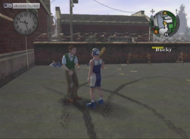 Parce qu’il est du genre à répondre et à jouer les rebelles en famille, Jimmy Hopkins, 15 ans, est envoyé par sa mère à la Bullworth Academy, un lycée réputé pour sa rigidité et spécialisé pour redresser les jeunes adolescents un brin perturbateurs. Mais l’attitude rebelle de Jimmy est aussi une excuse toute trouvée pour que sa mère puisse aller roucouler sous les cocotiers avec son nouvel amant, pas franchement apprécier par notre bad boy en culottes courtes. Pas facile aussi de s’attacher à un inconnu, surtout lorsqu’il s’agit de la cinquième conquête de sa mère. Le crâne rasé, l’oreille gauche percée, la chemise pas rentrée et l’air ironique, Jimmy entre davantage dans la catégorie des loubards que des enfants de bonne famille. Un sobriquet qui lui sied à merveille puisque ce dernier s’autoproclame en tant que tel et compte bien se faire valoir par ses propres méthodes. Aussi, il ne bronchera pas d’un cil lorsqu’il fera la rencontre avec le proviseur, un brin sadique qui compte bien faire de Jimmy un adolescent obéissant, peu importe les moyens employés. Une cinématique d’intro efficace, des personnages au caractère bien trempé, des dialogues percutants et croustillants, en l’espace de quelques minutes, Rockstar Games a réussi à imposer une ambiance, qui nous tiendra d’ailleurs en haleine jusqu’à la fin du jeu.