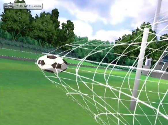 Reste enfin un jeu simplifié à l’extrême dans ses à-côtés : les coups de pieds arrêtés sont tirés automatiquement, un unique tacle est disponible pour engager le contact, et ne cherchez pas la faute, il n’y a pas d’arbitre de toutes façons. Tout ceci afin de maintenir une fluidité et que l’action ne tombe pas, ce qui s’avère pourtant immanquablement le cas avant chaque passe/centre/tir. Ce constat est d’ailleurs aggravé en mode deux joueurs, dans lequel la vue bascule vers un jeu de football classique afin de ne pas séparer l’écran en deux. De même on ne dirige pas qu’un seul joueur, mais l’ensemble de l’équipe, donc en mode deux joueurs Captain Tsubasa à le postérieur entre deux tabourets et aurait peut être du devenir un jeu de foot classique, en conservant simplement son système de défis. En effet, dans le cadre d’un jeu à deux, le fait que l’action soit stoppée à la moindre passe devient rapidement un tue-l’amour ludique en puissance, et la frénésie des événements scéniques ne parvient plus à nous détourner de l’ennui et de la frustration. Techniquement, pour ne pas déroger à la tradition des adaptations d’anime de Bandai Namco Games, le jeu est bien évidemment hideux, encore que étant donné le côté sommaire du graphisme original de Yôichi Takahashi, on pourrait presque parler de fidélité esthétique. On reconnaît d’ailleurs sans peine Olivier Atton, Marc Landers, Ben Becker, ou encore les frères Derrick (les patronymes français, c’est juste pour emmerder les puristes) et c’est probablement le principal. Dommage quand même que la réalisation soit naze au point de se mettre à ramer de temps en temps.