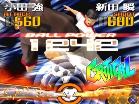 La possession de la balle repose donc essentiellement sur un système de timing malheureusement assez flou, que l’on n’a jamais vraiment la sensation de maîtriser. Chaque aspirant au cuir possède une jauge d’énergie, qui risque de baisser si l’exercice de timing, qui consiste à appuyer trois fois sur une touche à un instant précis, n’est pas exécuté à la perfection. C’est en tout cas celui qui garde sa jauge la plus remplie qui remporte l’action, quelle que soit sa nature, et donc qui s’octroie la balle. Marquer un but repose sur un principe assez similaire, si ce n’est que cette fois il est intéressant de découvrir une combinaison précise de trois touches qui permettra au faucon de prendre son envol, à la feuille morte de piquer au sol, au tigre de transpercer la cage thoracique du portier adverse, bref de faire comme dans la mythologie Olive et Tom. Concrètement pour un tir, de l’exercice de timing dépend un nombre de points de force de frappe, et ce nombre peut être amoindri par l’intervention d’éventuels défenseurs suicidaires, si des membres du verrou adverse se trouvaient devant vous au moment où vous avez décidé d’enclencher la frappe. Mais c’est bien entendu au gardien de faire le plus gros du travail. Chaque portier dispose d’un chiffre de référence, par exemple 600. Pour que la balle entre dans le filet, sa puissance doit être supérieure au chiffre de référence du gardien, après qu’il ait effectué son arrêt en mimant la séquence timing effectuée par l’attaquant. Et, malheureusement, cela n’arrive pas très souvent puisque de manière générale, il est trop facile pour un gardien de stopper n’importe quelle balle à moins de s’être vraiment endormi pendant le timing. Il faut donc se créer de vraies occasions pour que le tir de base dispose d’une force de frappe déjà conséquente, et il ne reste plus qu’à prier pour réussir un ou deux Critical dans le timing pour crucifier l’homme ganté.